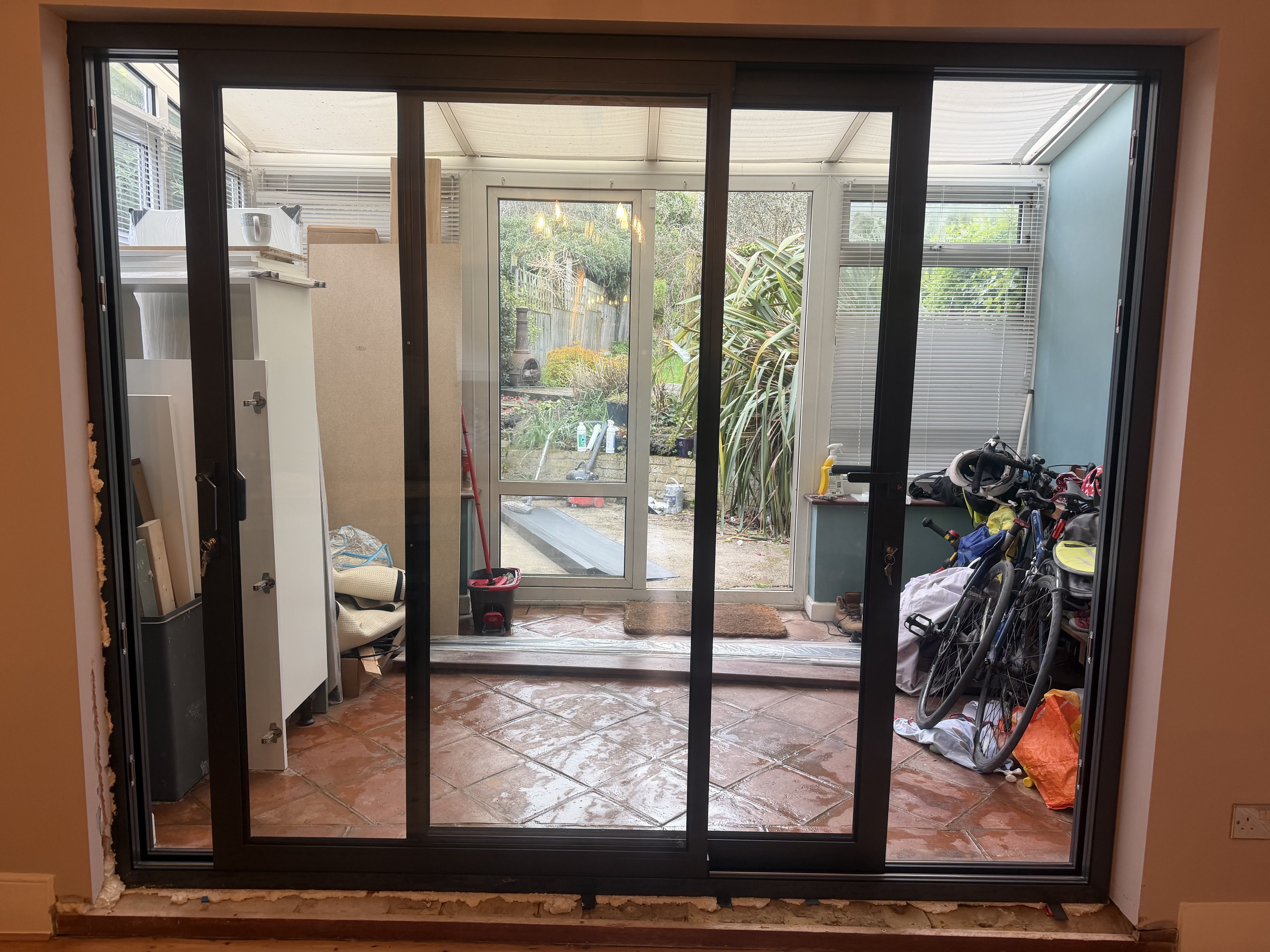 ⚡️Installation of a bespoke aluminium sliding door in a contemporary anthracite grey finish.