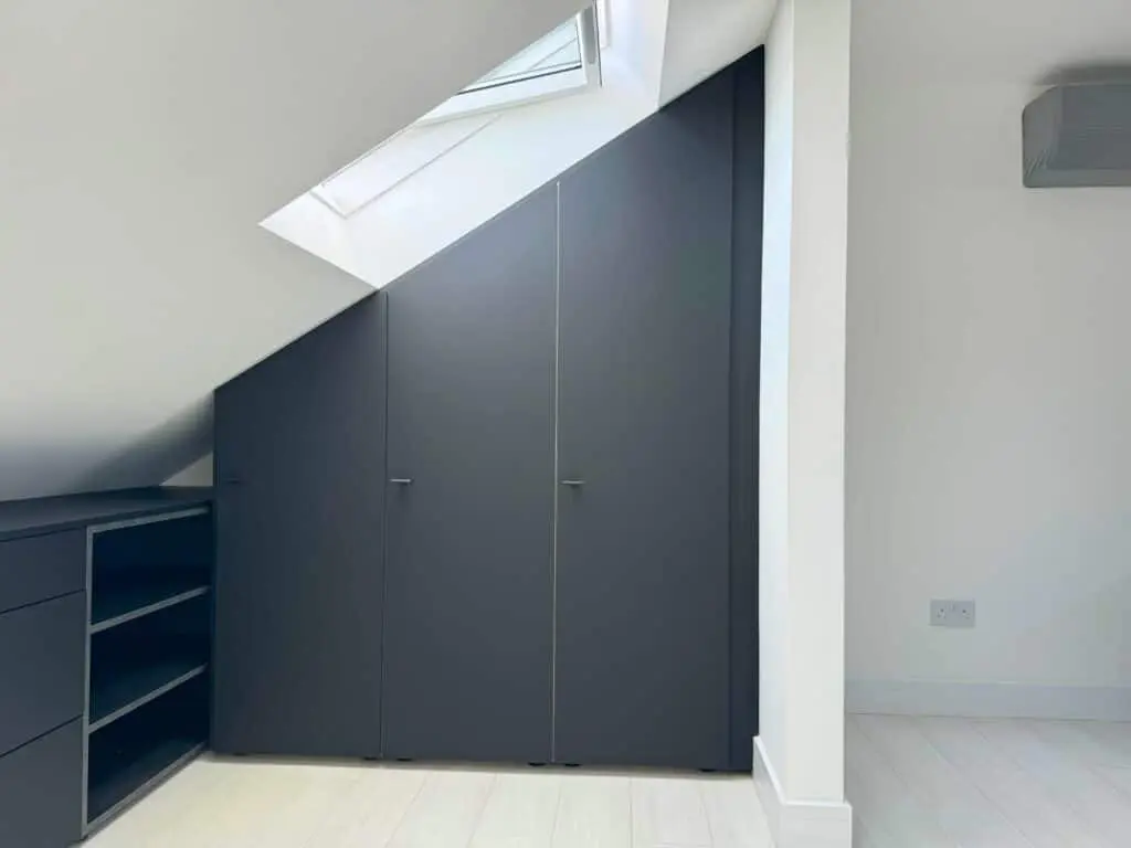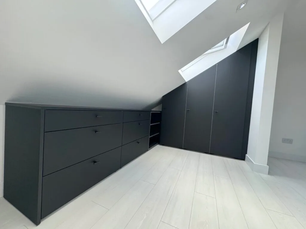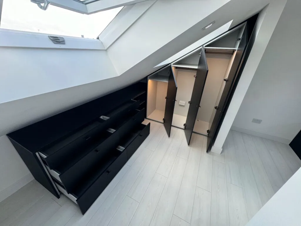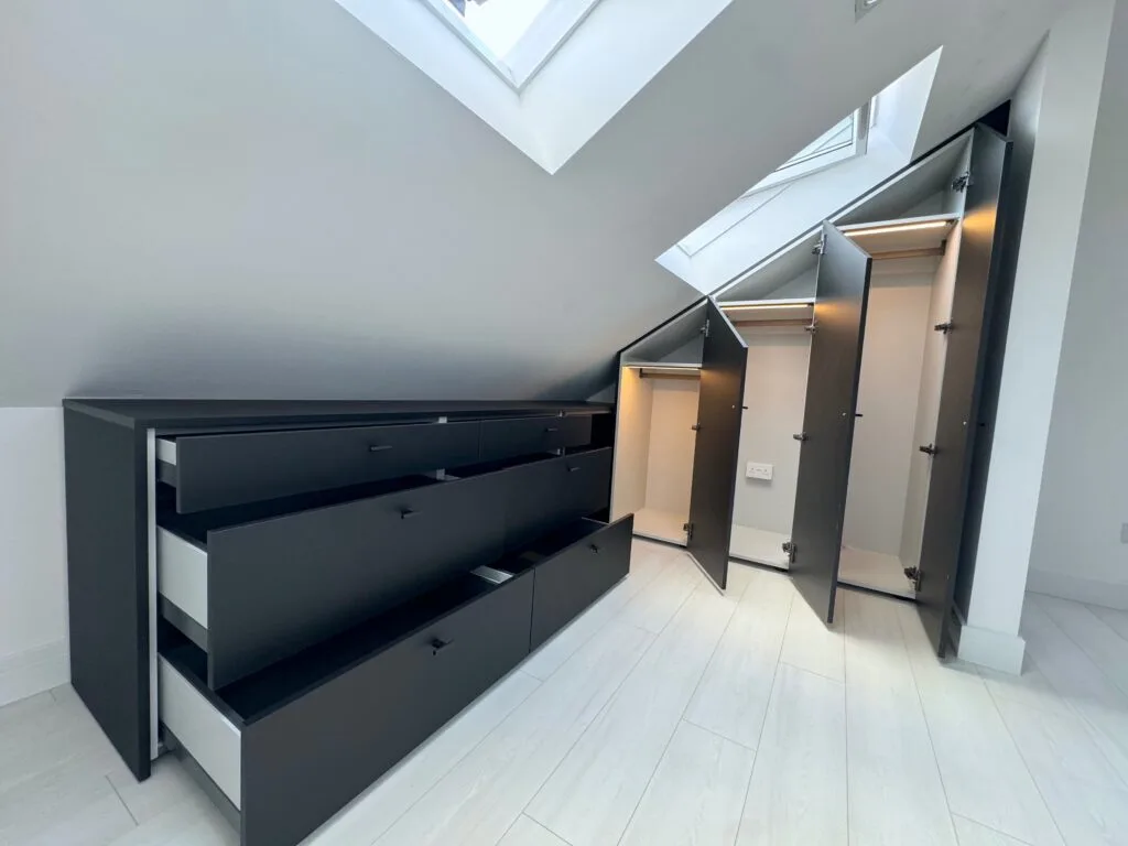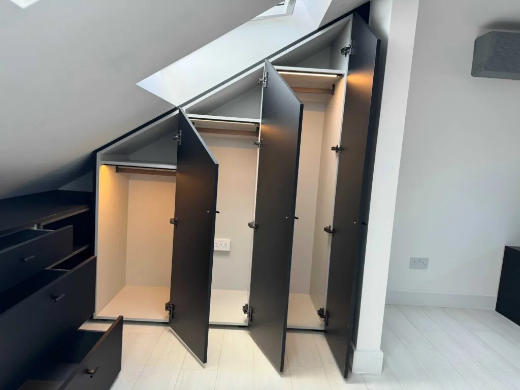 Unlock the full potential of your unique spaces with our premium angled wardrobe installation services. Tailored for challenging layouts—such as rooms with sloped ceilings, attic alcoves, and under-stair nooks—our custom wardrobe solutions combine elegance with optimised functionality.