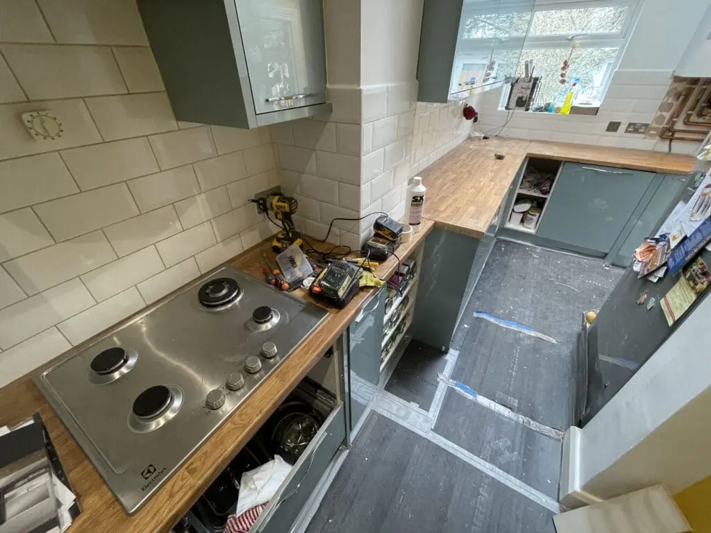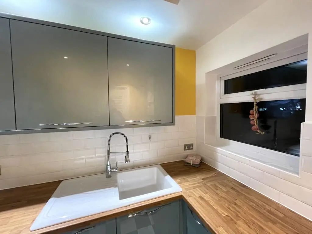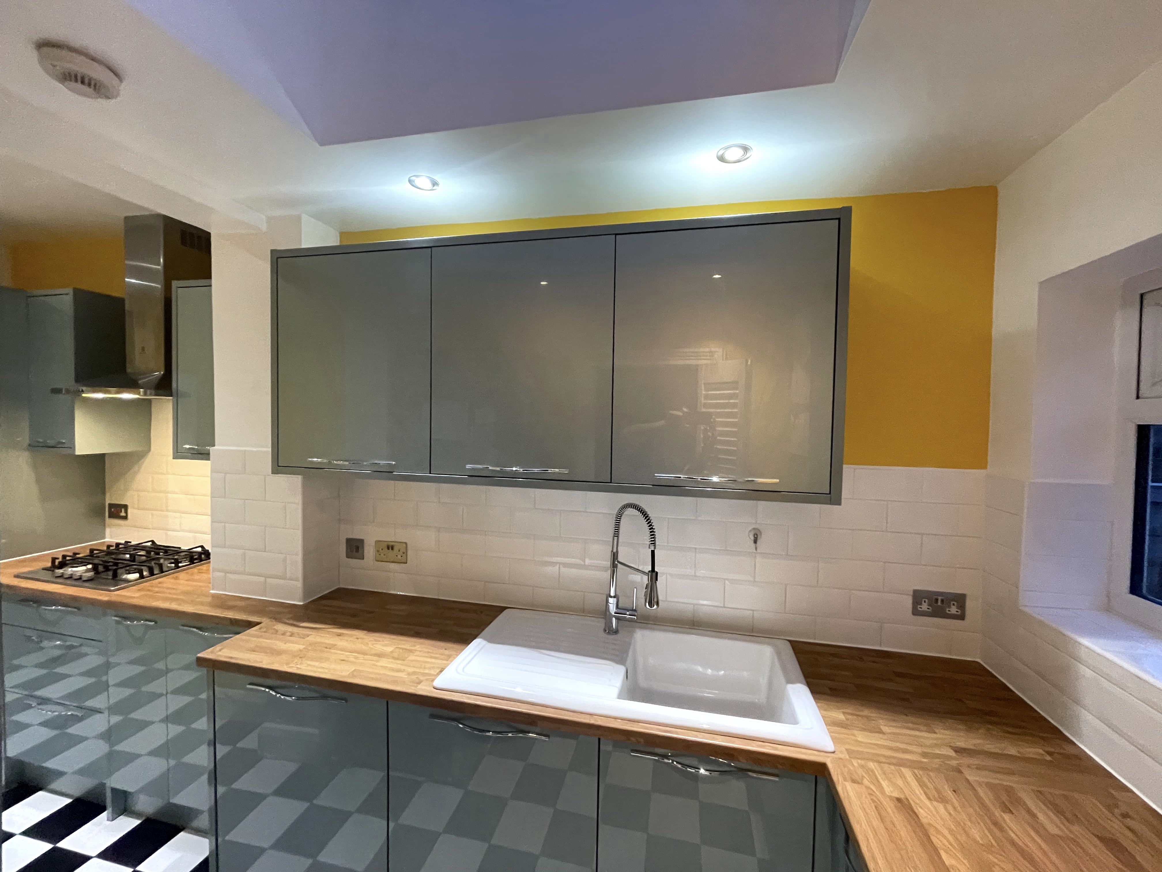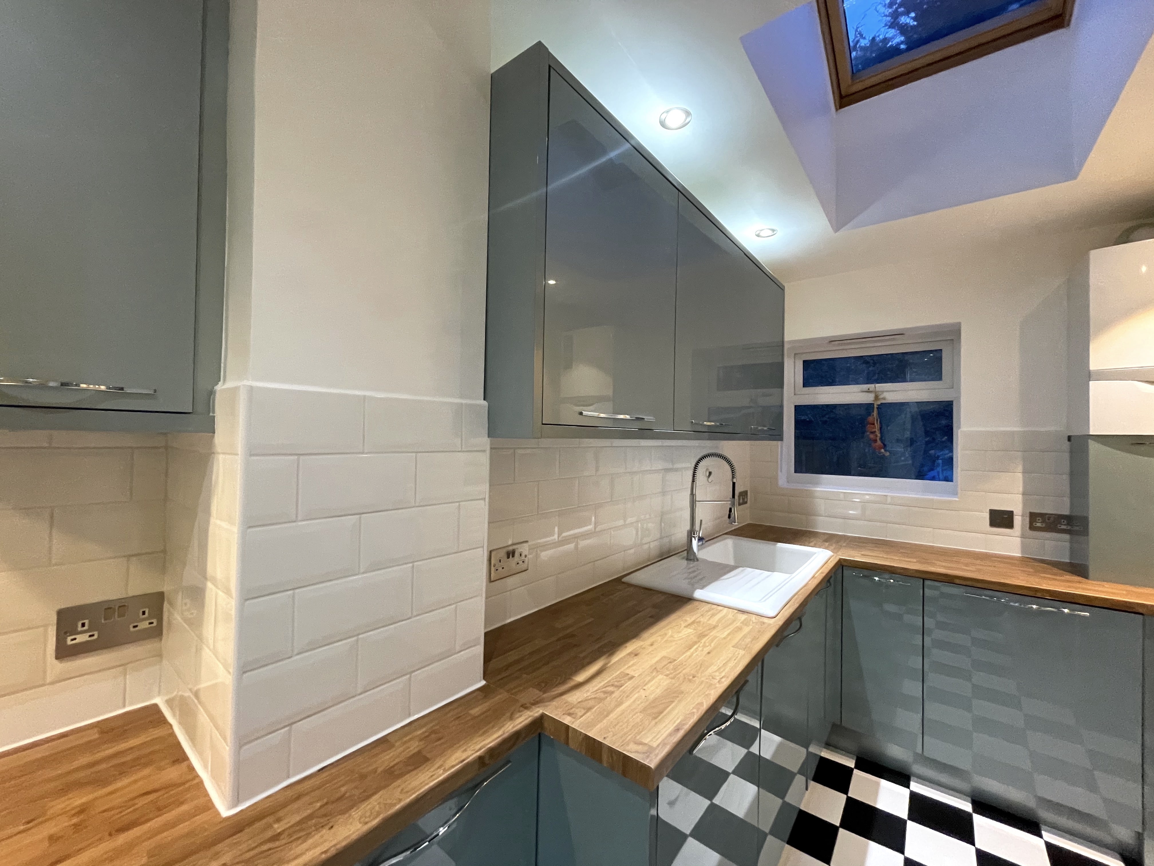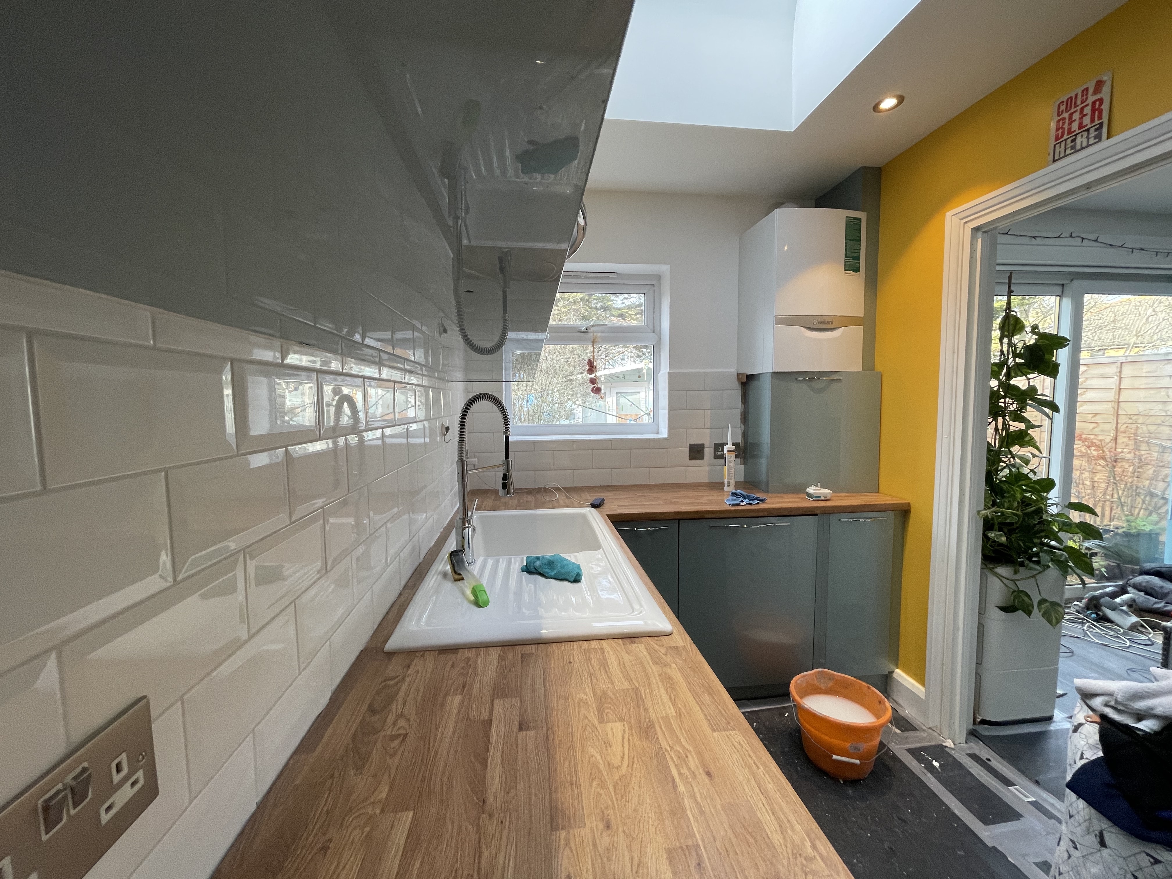 During 2 weeks we also refreshed kitchen with new grout, new worktops, sink and tap, boxed in Combi Boiler matching existing kitchen furniture.