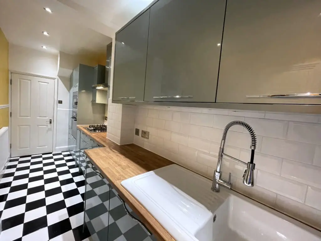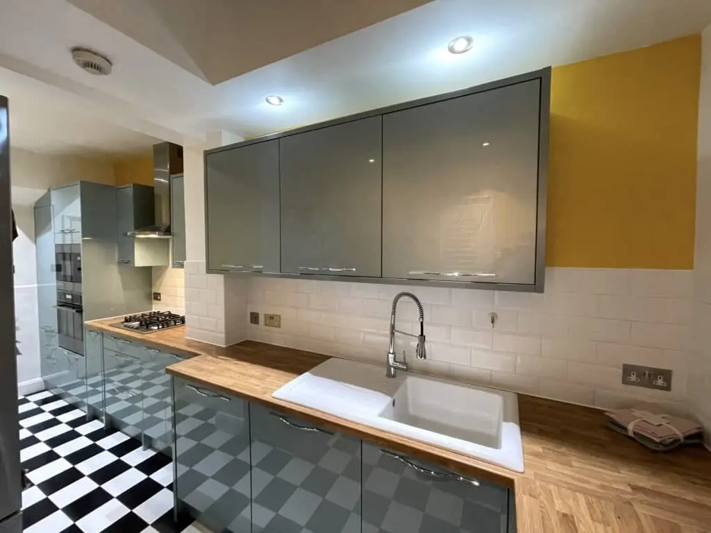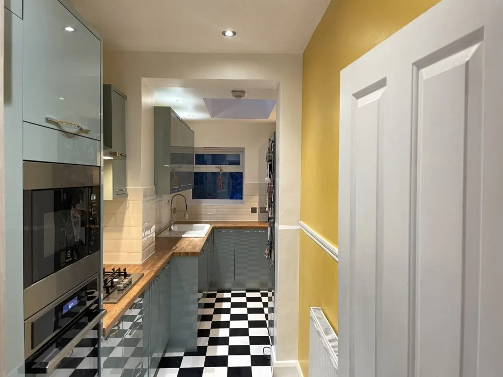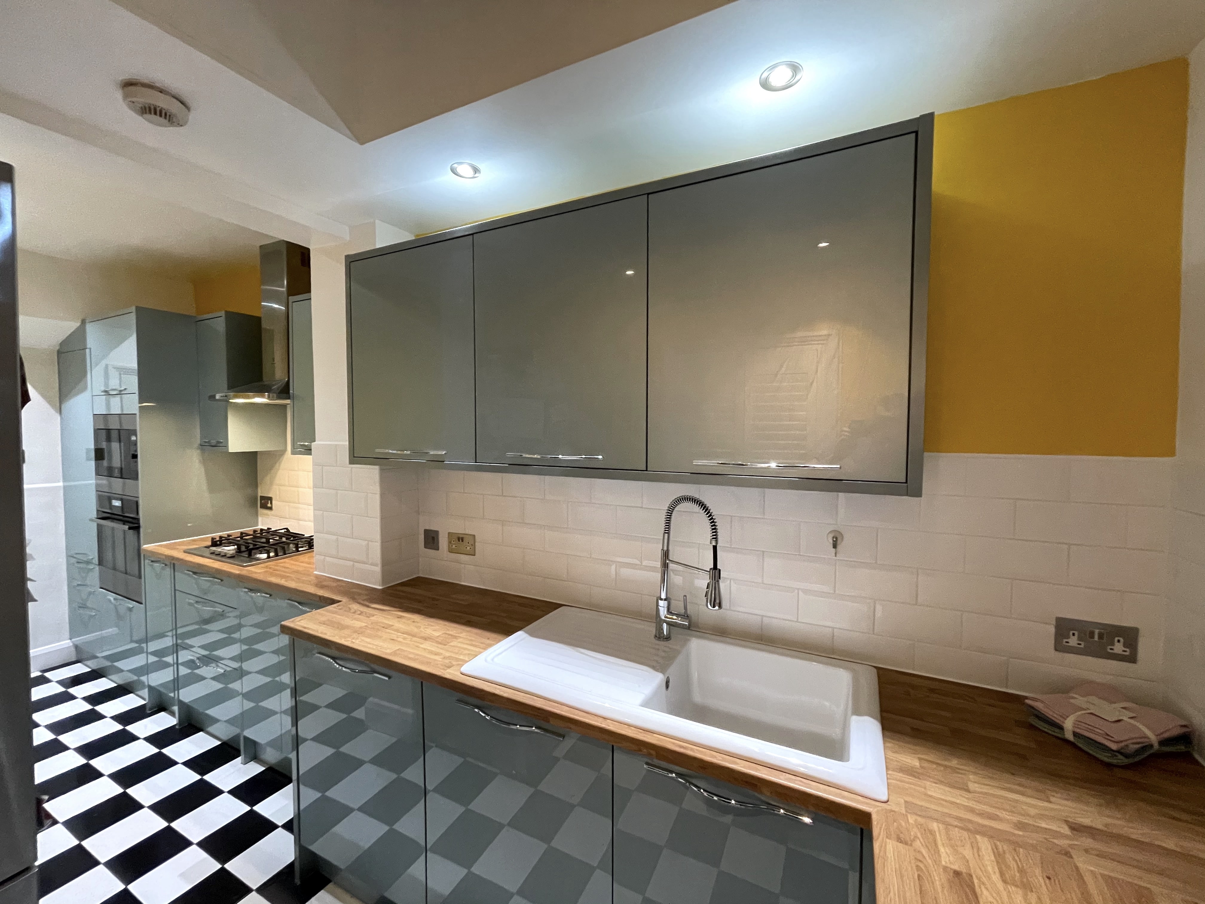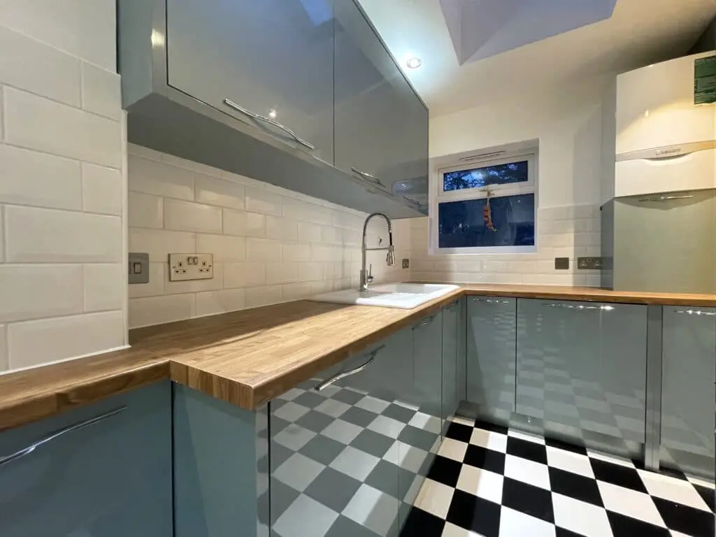 During 2 weeks we also refreshed kitchen with new grout, new worktops, sink and tap, boxed in Combi Boiler matching existing kitchen furniture.