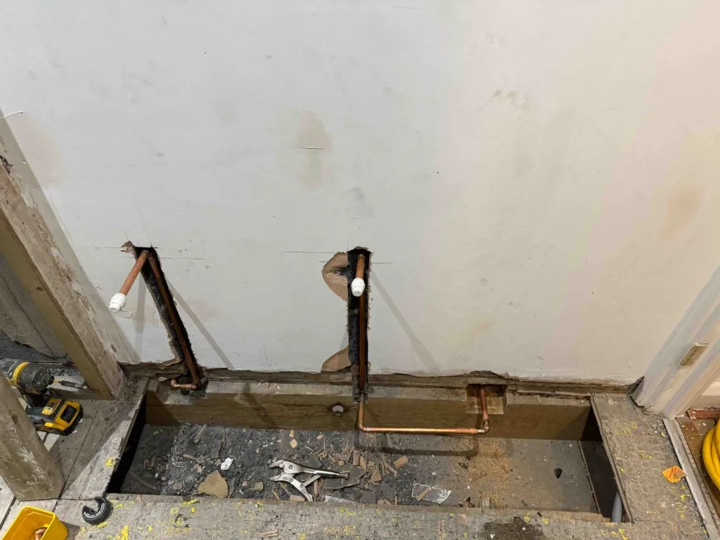 🔍 Furthermore, the existing cold-water pipe had been left under the floorboards and wasn’t connected to the main pipe of the cylinder (looks like they omitted to connect.) The floor tiles had already been laid.