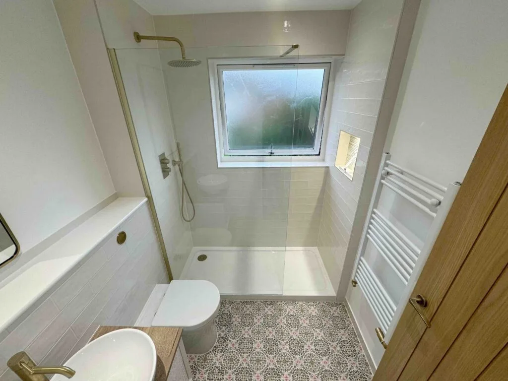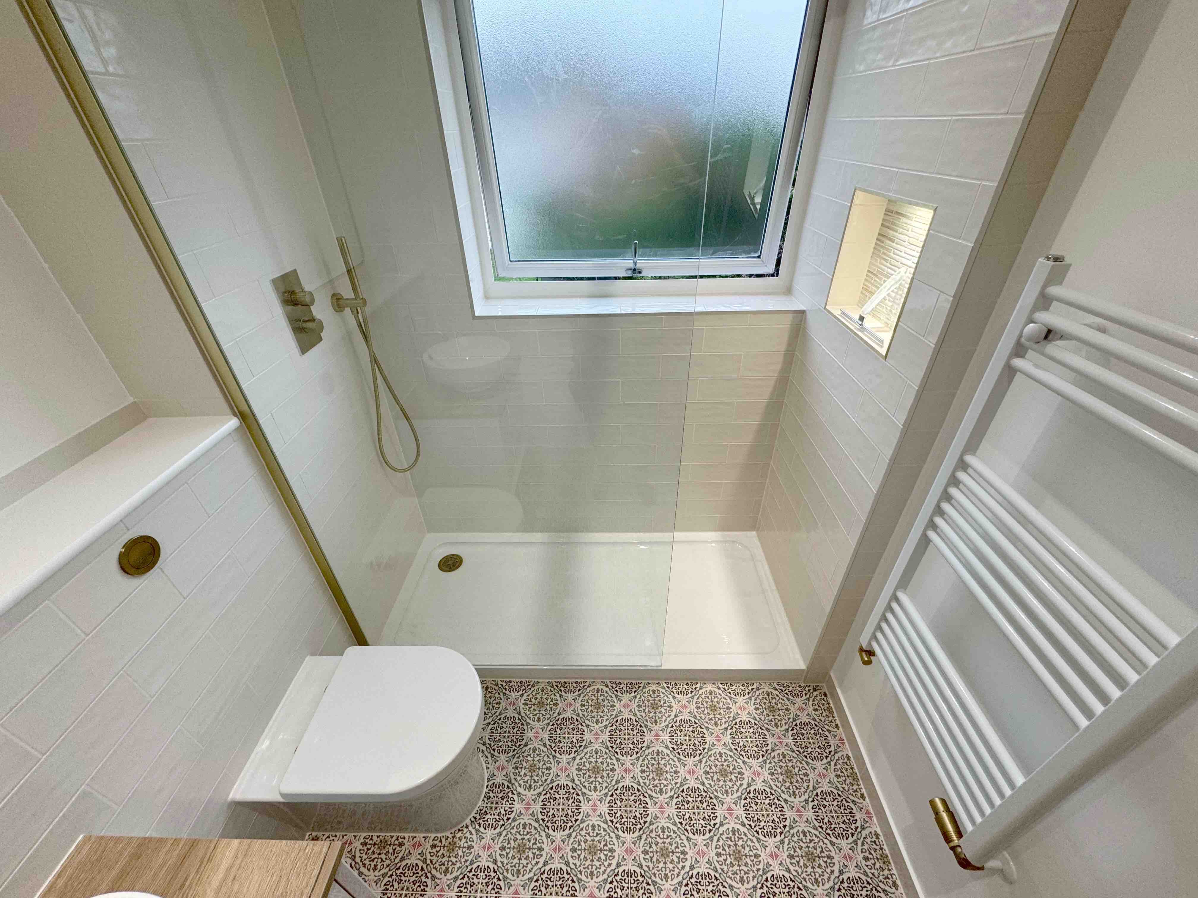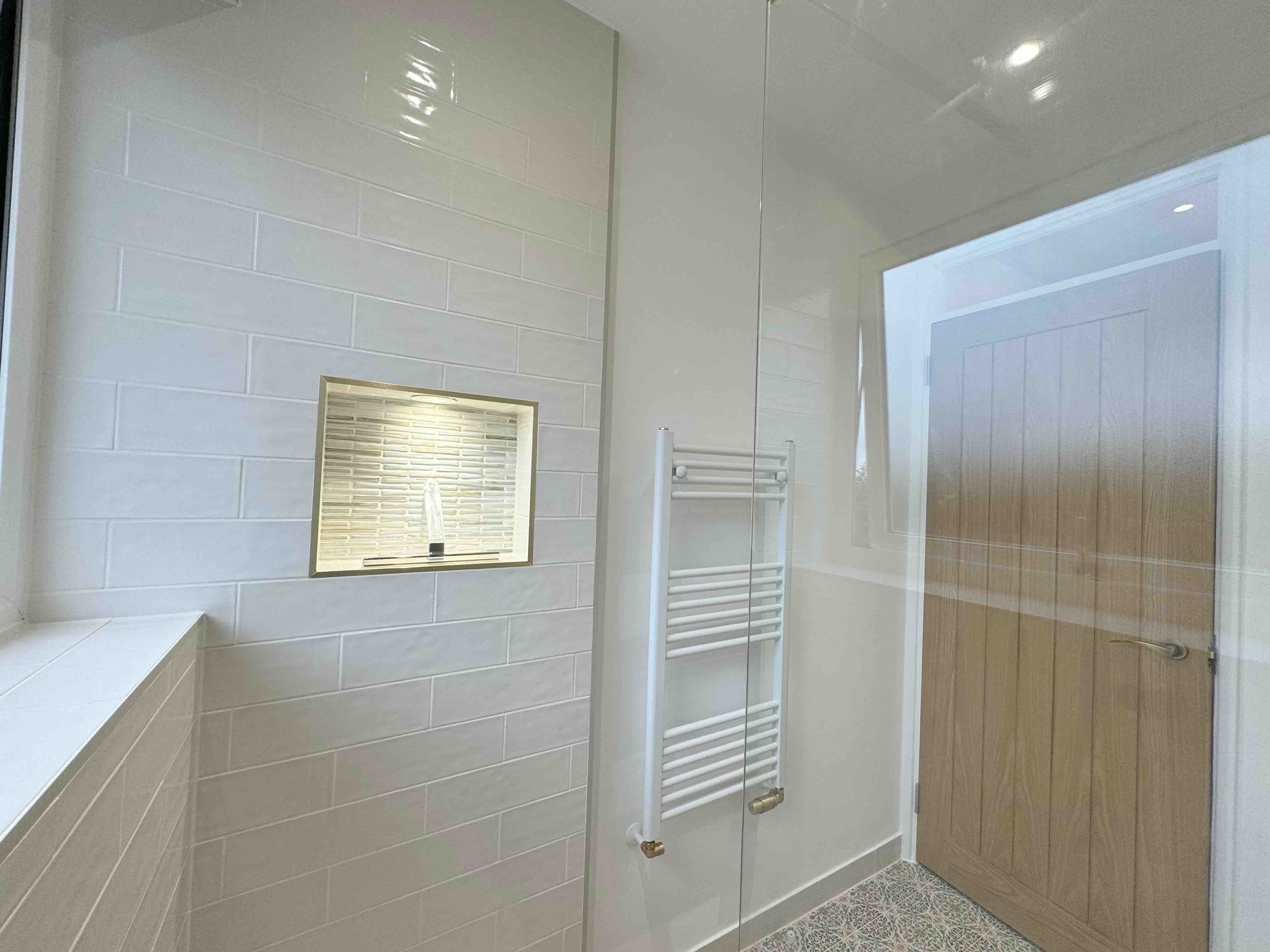 🔍 Unfortunately the first fix of plumbing was unprofessional in its finish, noticeably the towel rail pipes were on show. They also failed to sort out the waste pipe near the ceiling which led to an untidy box panel jutting out.