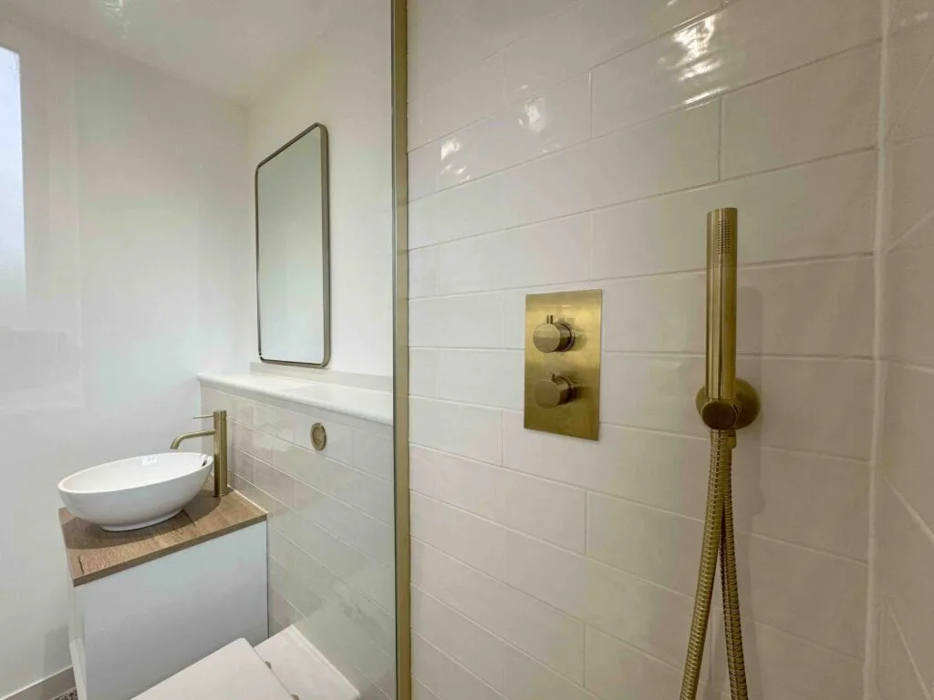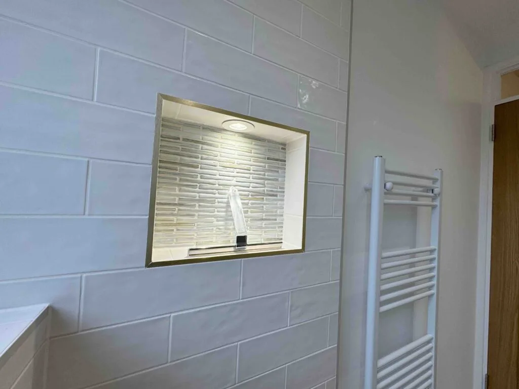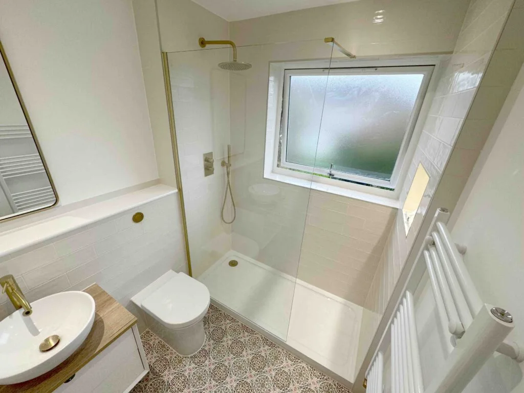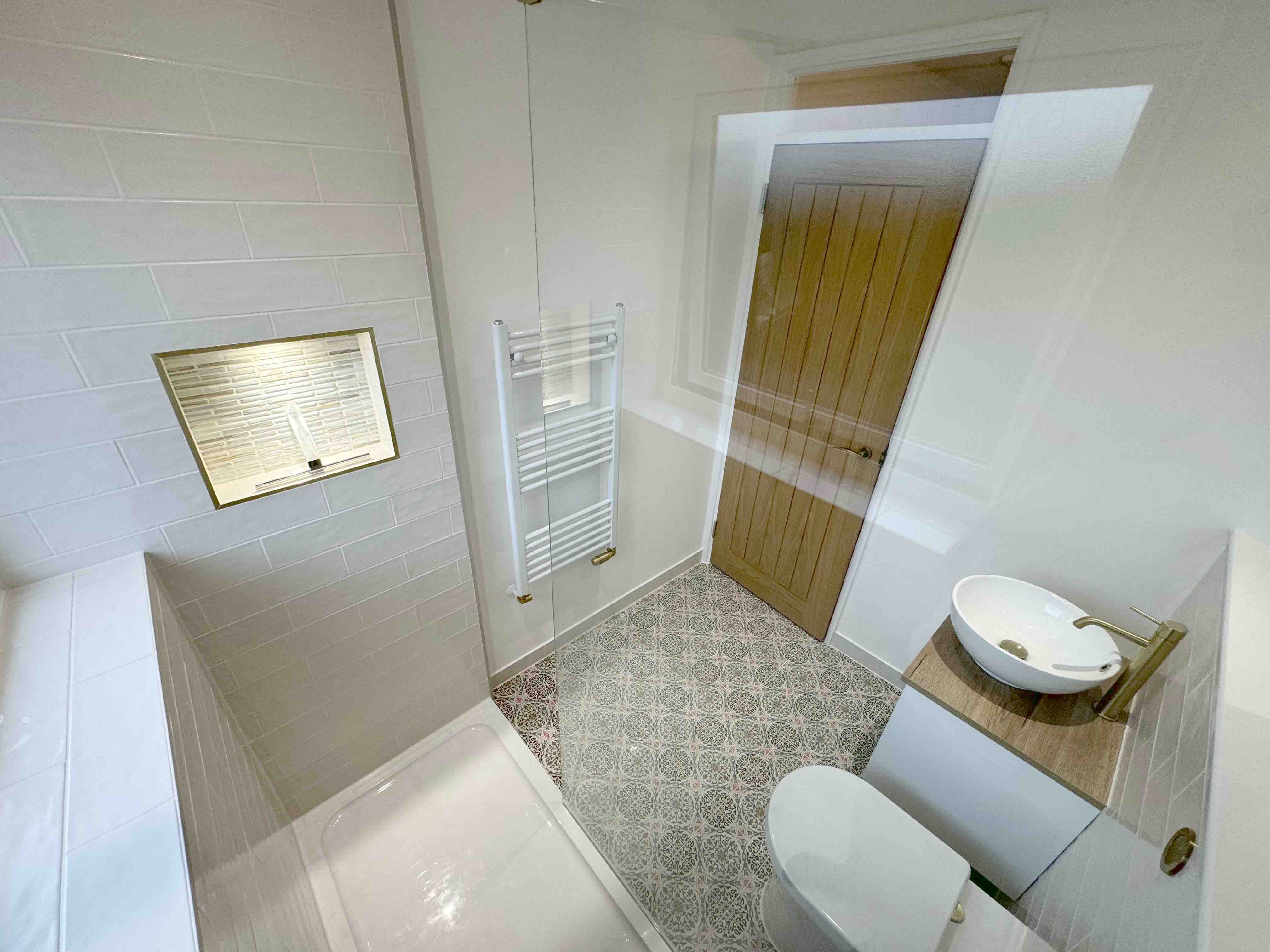🔍 Unfortunately the first fix of plumbing was unprofessional in its finish, noticeably the towel rail pipes were on show. They also failed to sort out the waste pipe near the ceiling which led to an untidy box panel jutting out.