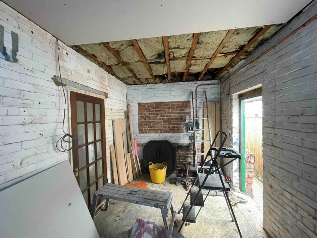 ⚡️Removing existing plasterboard from the ceiling, insulation, closing up with 2 lay of plasterboard for a better support by avoiding any cracks in the future;