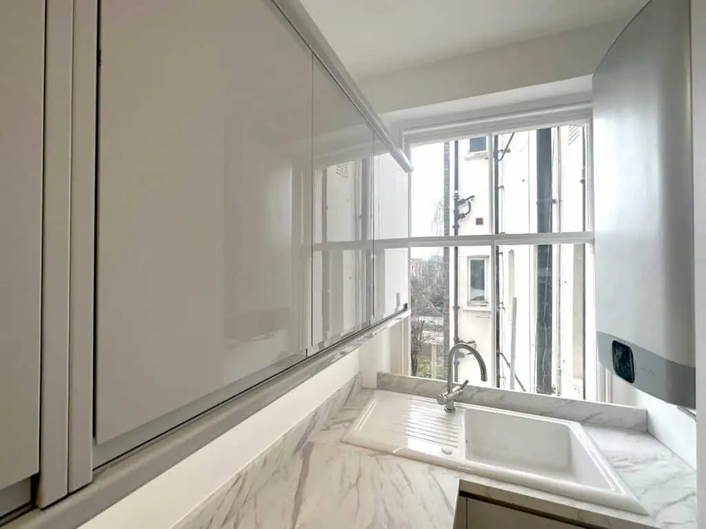 ⚡️If you check the size of the kitchen, you will realise that even with a tiny space you can have all integrated appliances like: Fridge and Freezer, Hob and Oven, Hood, Microwave, Dishwasher. Many cabinets as a storage to keep everything as required. We also managed to fit a new hot water faucet with freshwater filter for our customer.