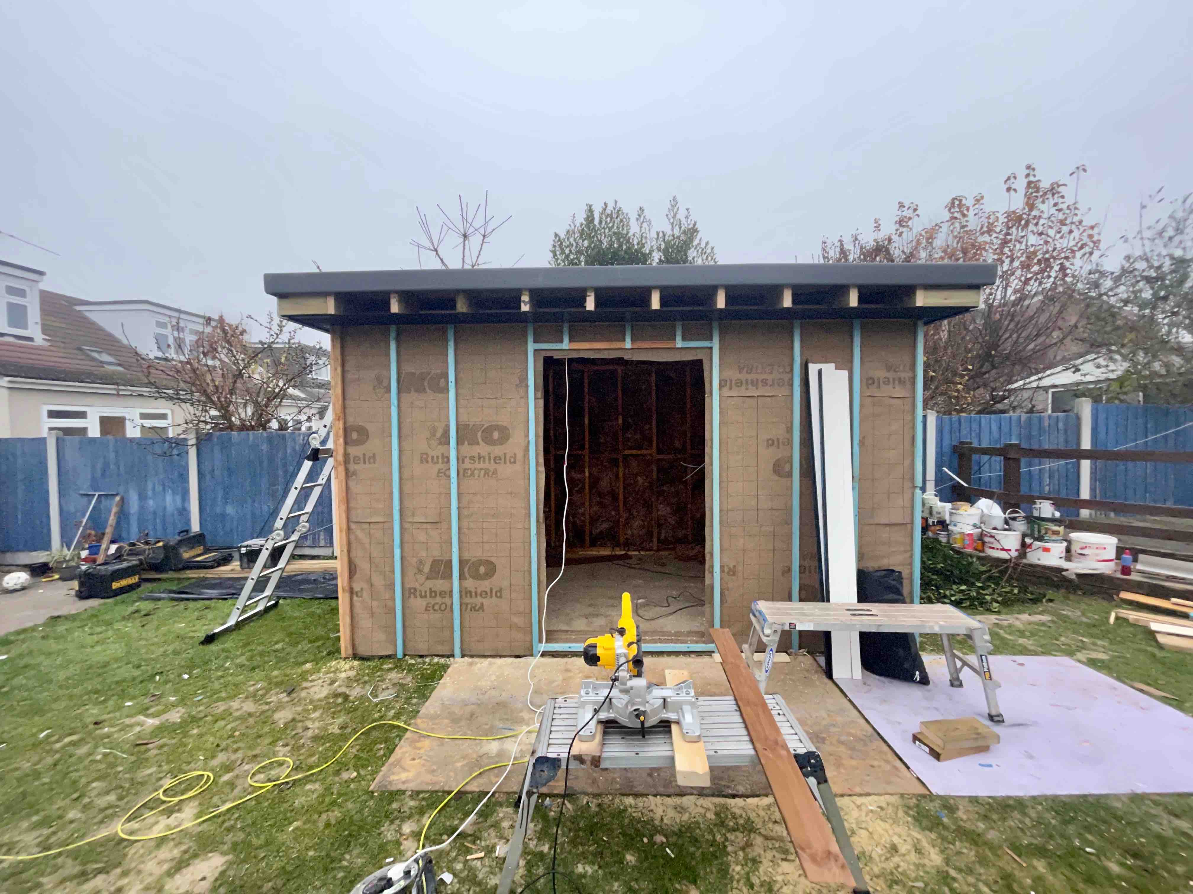 ⚡️ Day six – Flat roof installation completed incl fascia boards, starting and completing cladding work;