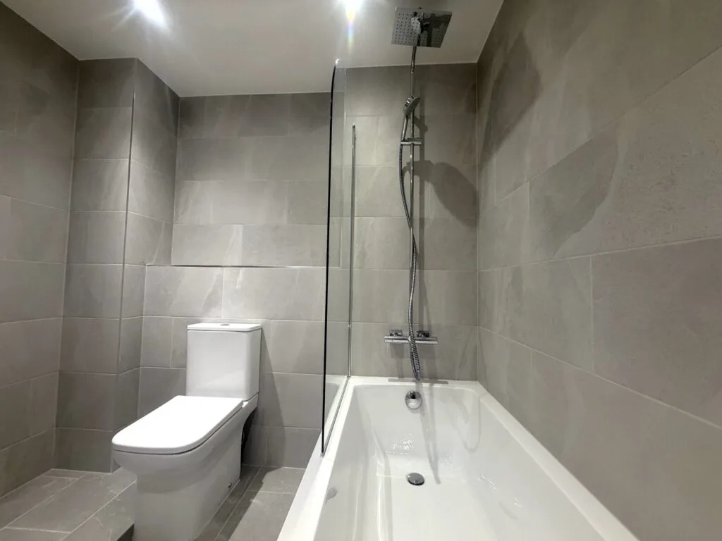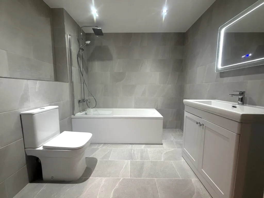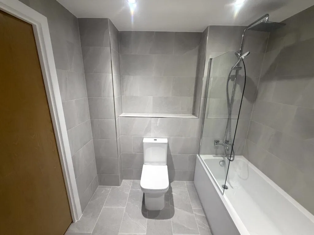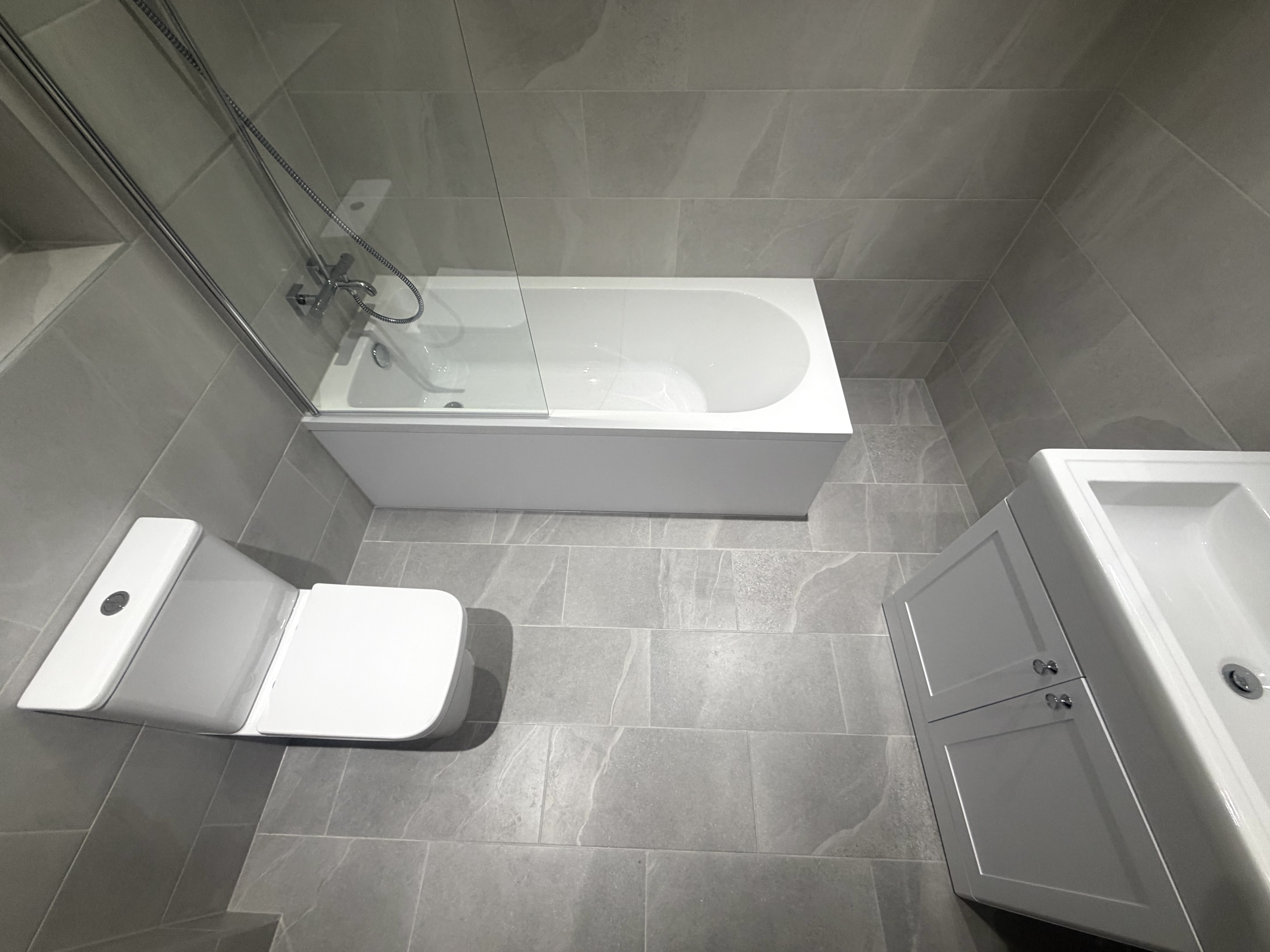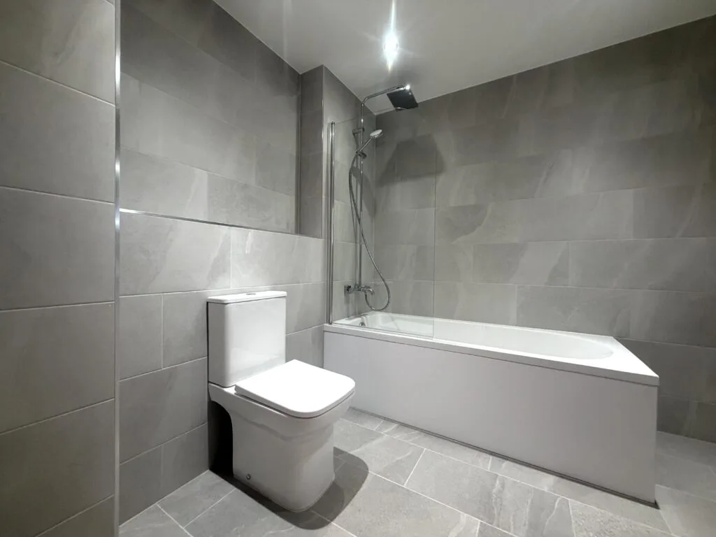 Large-format grey porcelain tiles have been installed throughout, creating a seamless, contemporary look with a subtle stone effect. The consistent layout enhances the sense of space while maintaining a refined and balanced appearance.