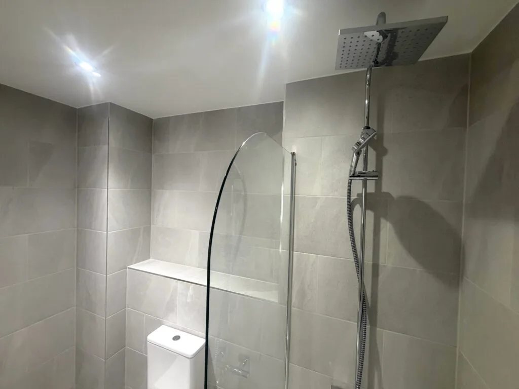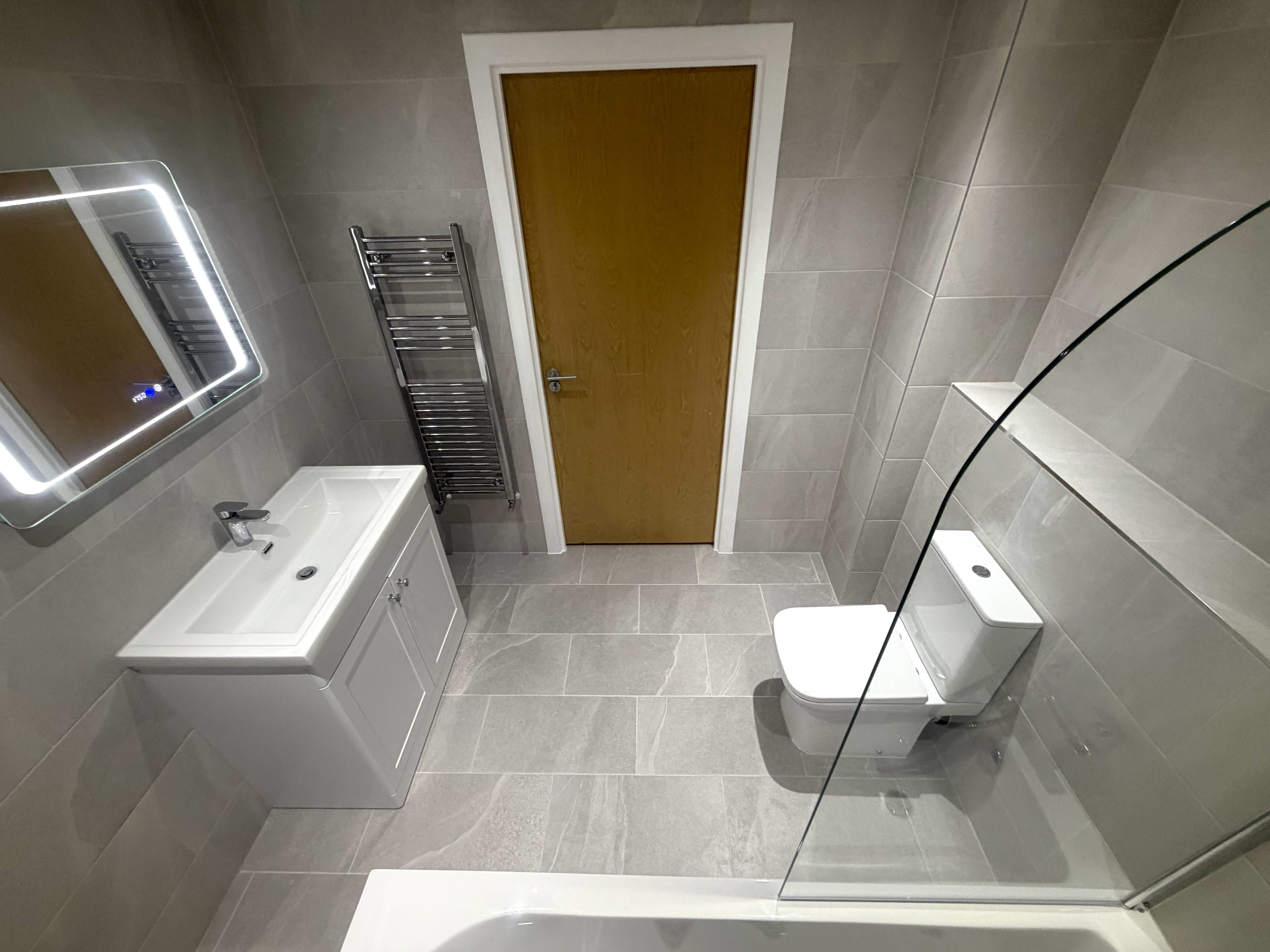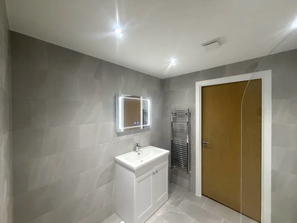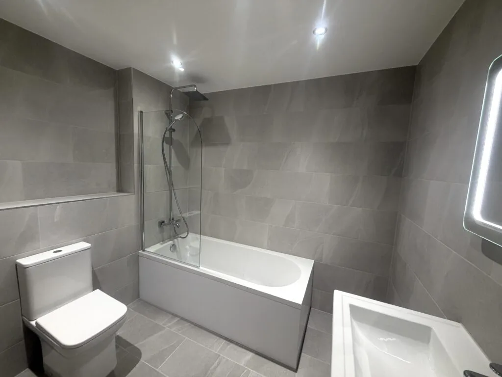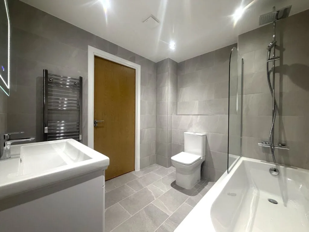Large-format grey porcelain tiles have been installed throughout, creating a seamless, contemporary look with a subtle stone effect. The consistent layout enhances the sense of space while maintaining a refined and balanced appearance.