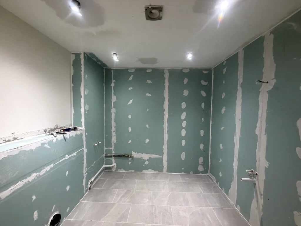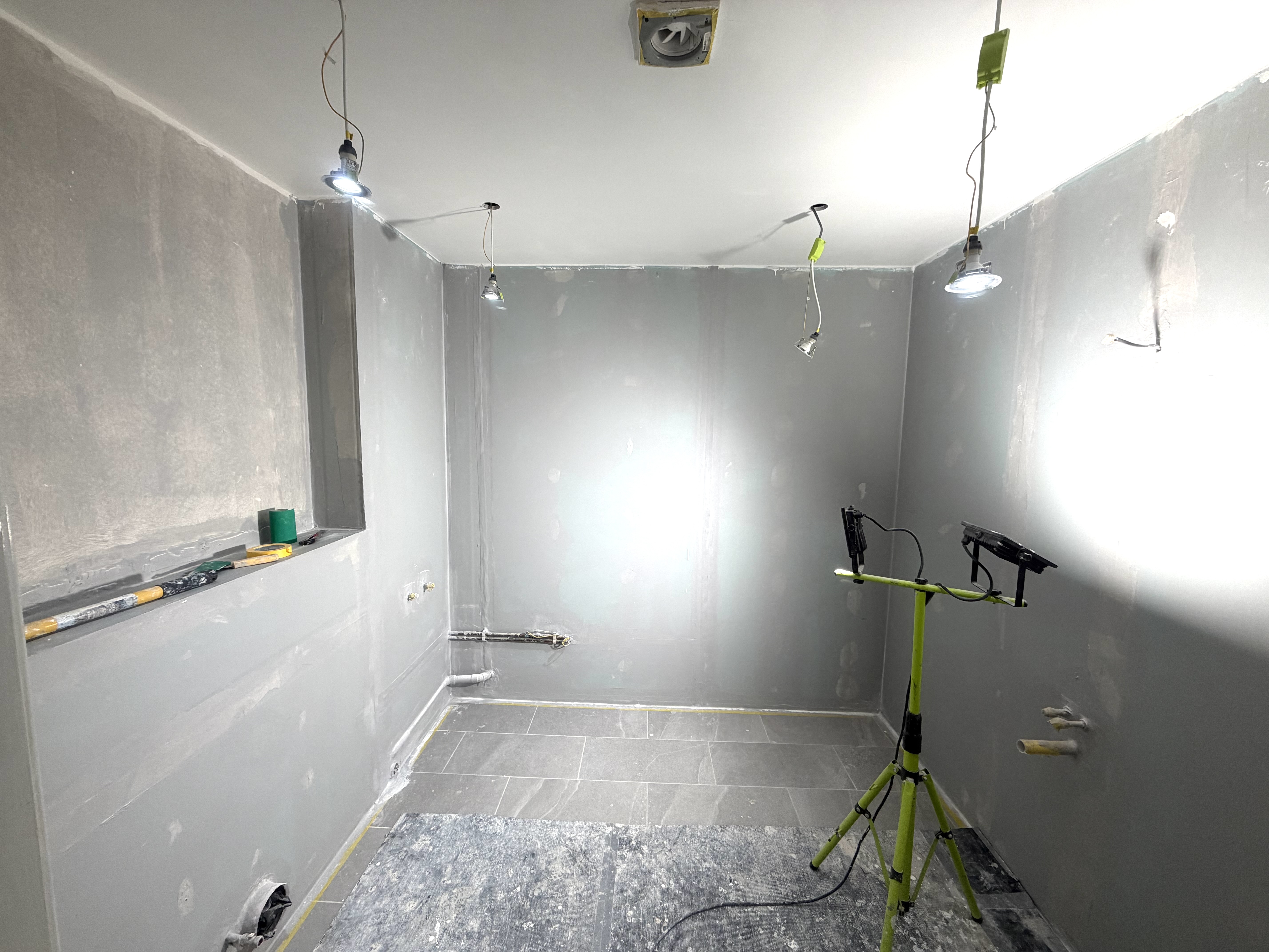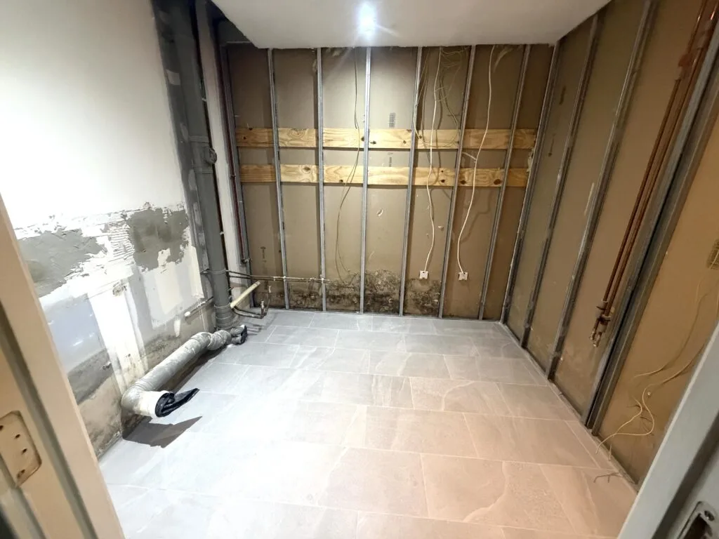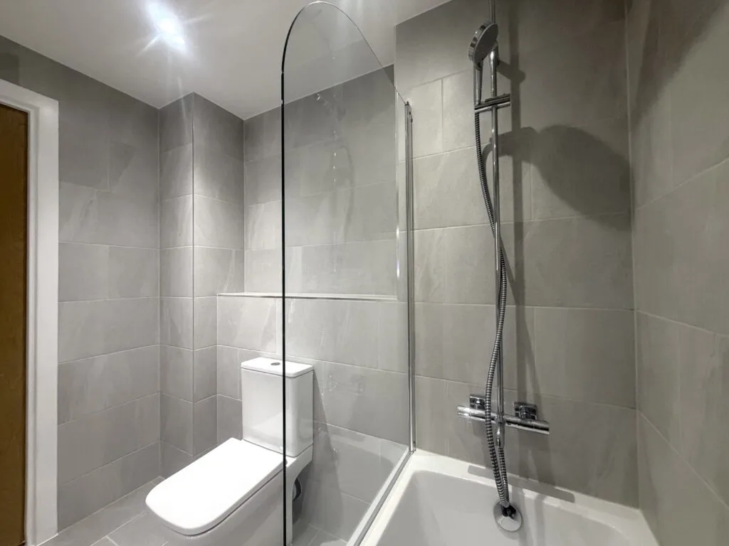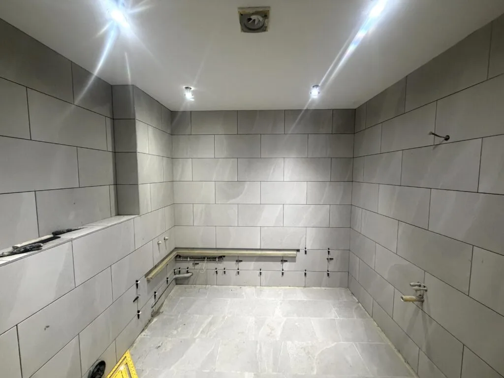 Large-format grey porcelain tiles have been installed throughout, creating a seamless, contemporary look with a subtle stone effect. The consistent layout enhances the sense of space while maintaining a refined and balanced appearance.