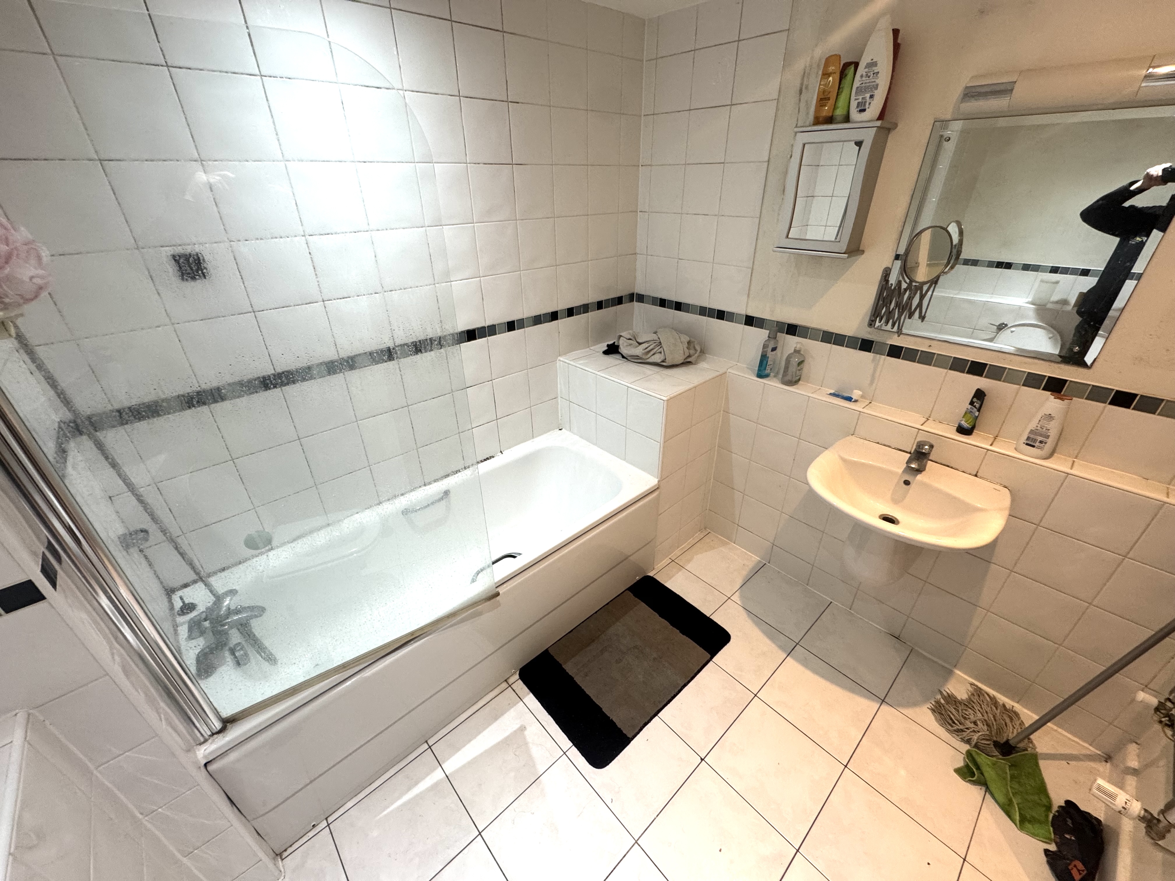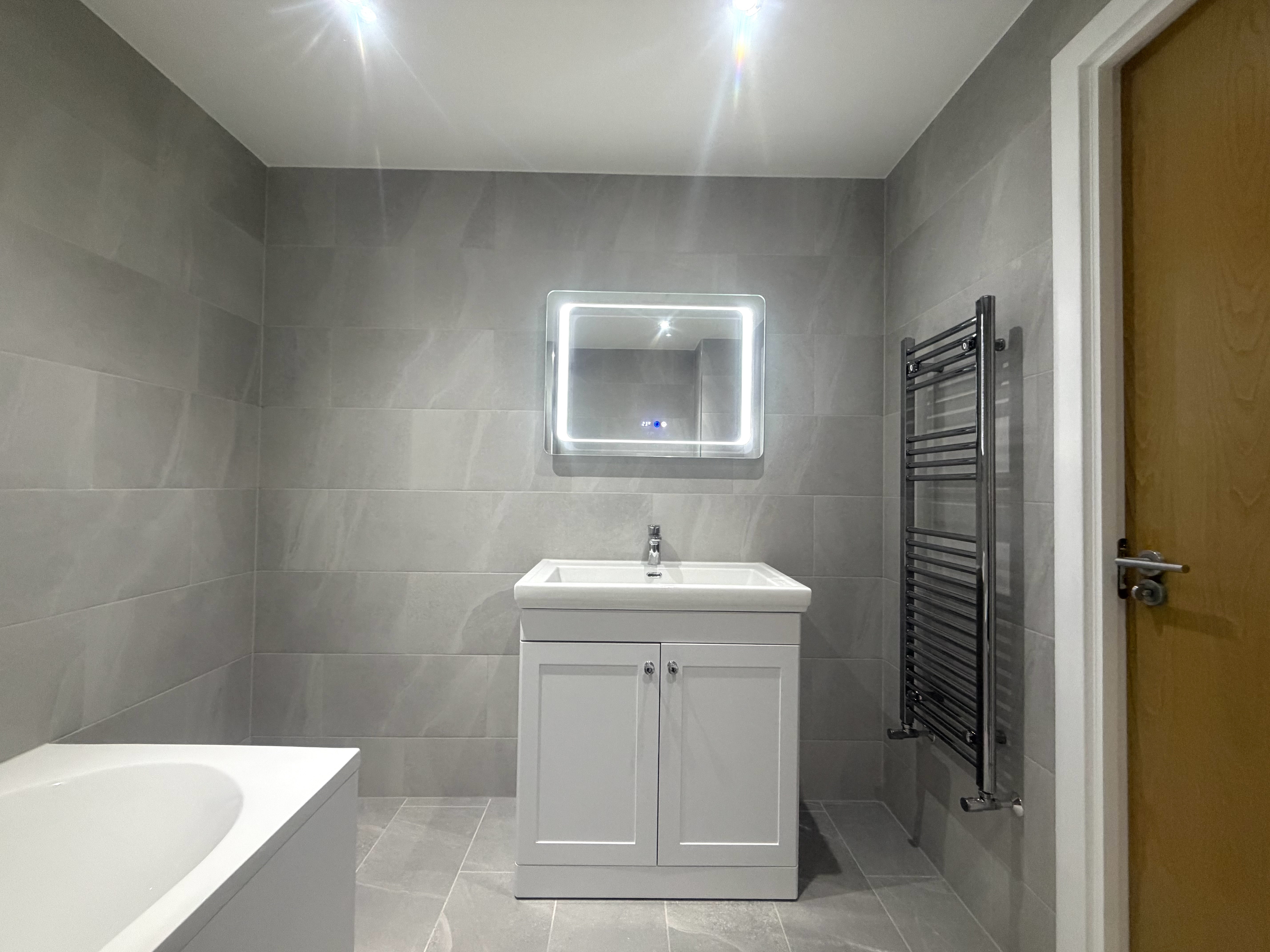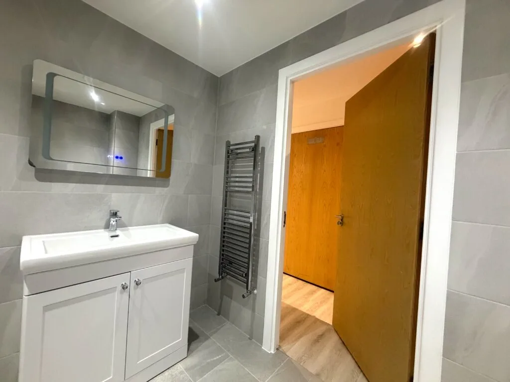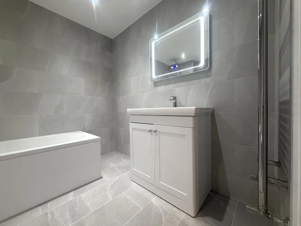 The bathroom features a modern bathtub with overhead rainfall shower and glass screen, offering both comfort and practicality. A sleek vanity unit with integrated basin provides essential storage while maintaining clean lines, complemented by chrome fittings and an illuminated LED mirror for a premium touch.