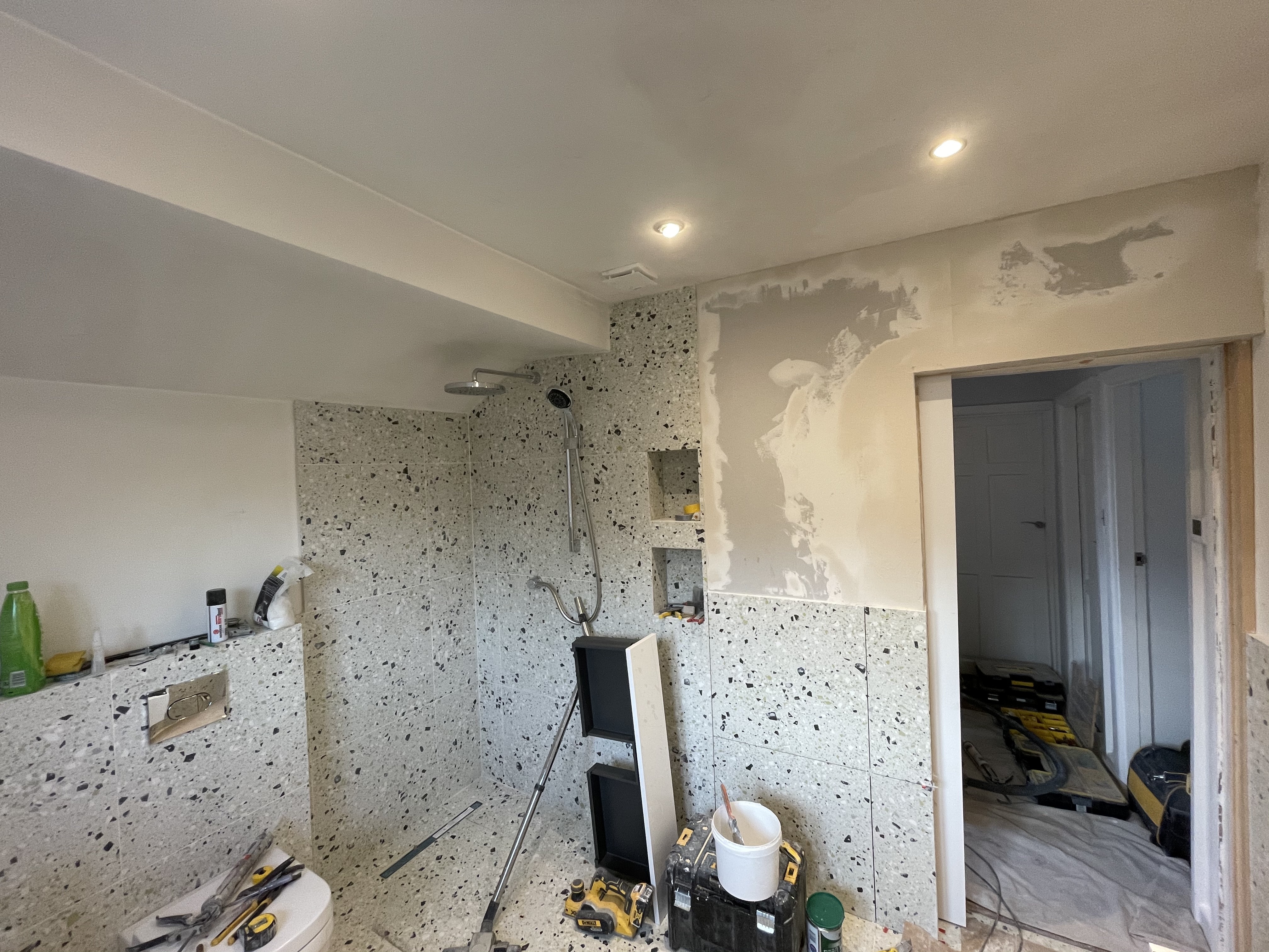 When we started the demolition work in the bathroom, we encountered further problems, the grout had cracked around the shower, the waterproof installation was defective, the floor and walls were uneven and there were cracks around the ceiling and walls, this was due to foundation movements. The builders had omitted to apply fibreglass before skimming or plastering.