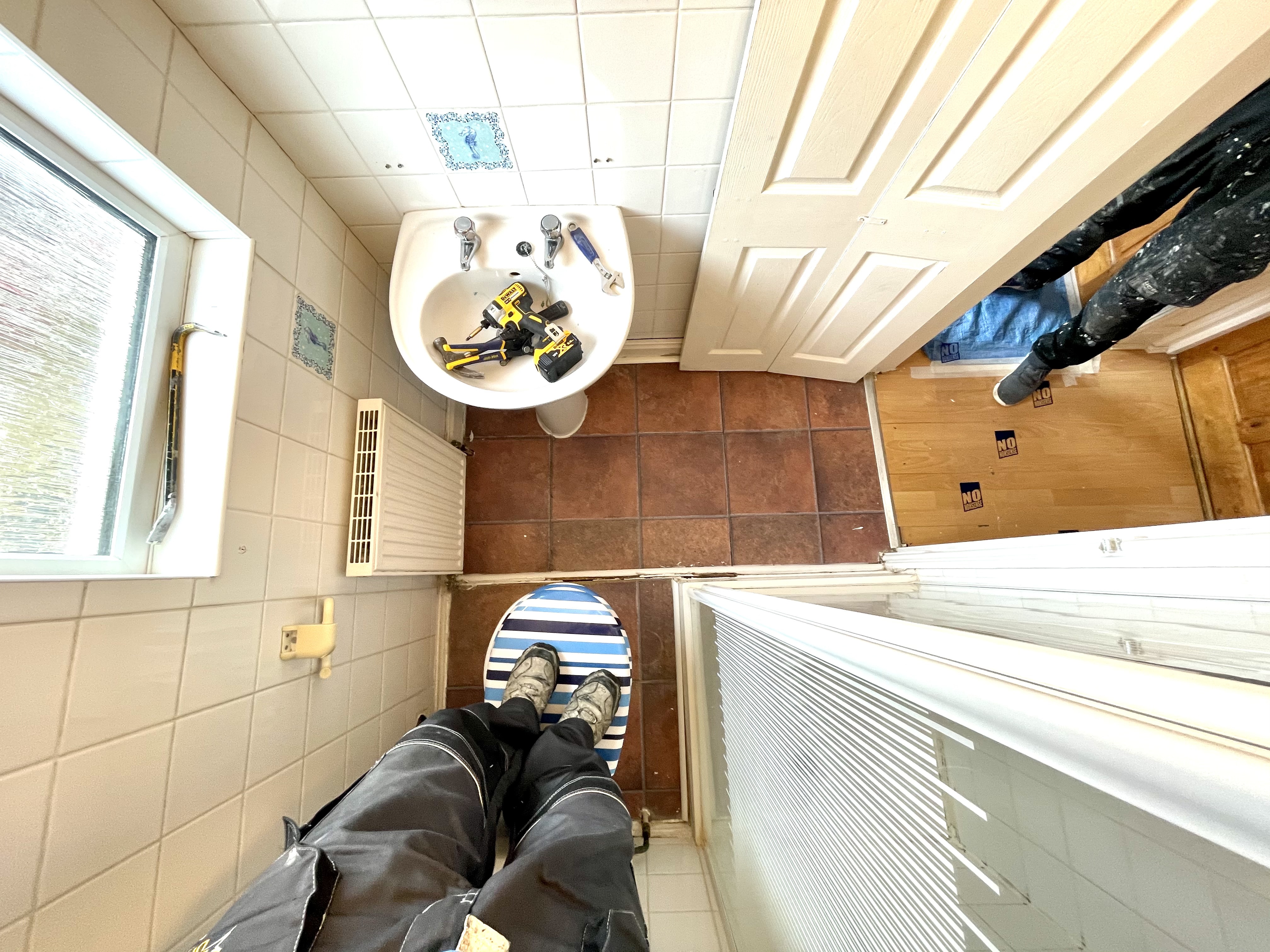When we arrived for the first time, we took some photos for our website. This is how the shower room was before and during renovation.