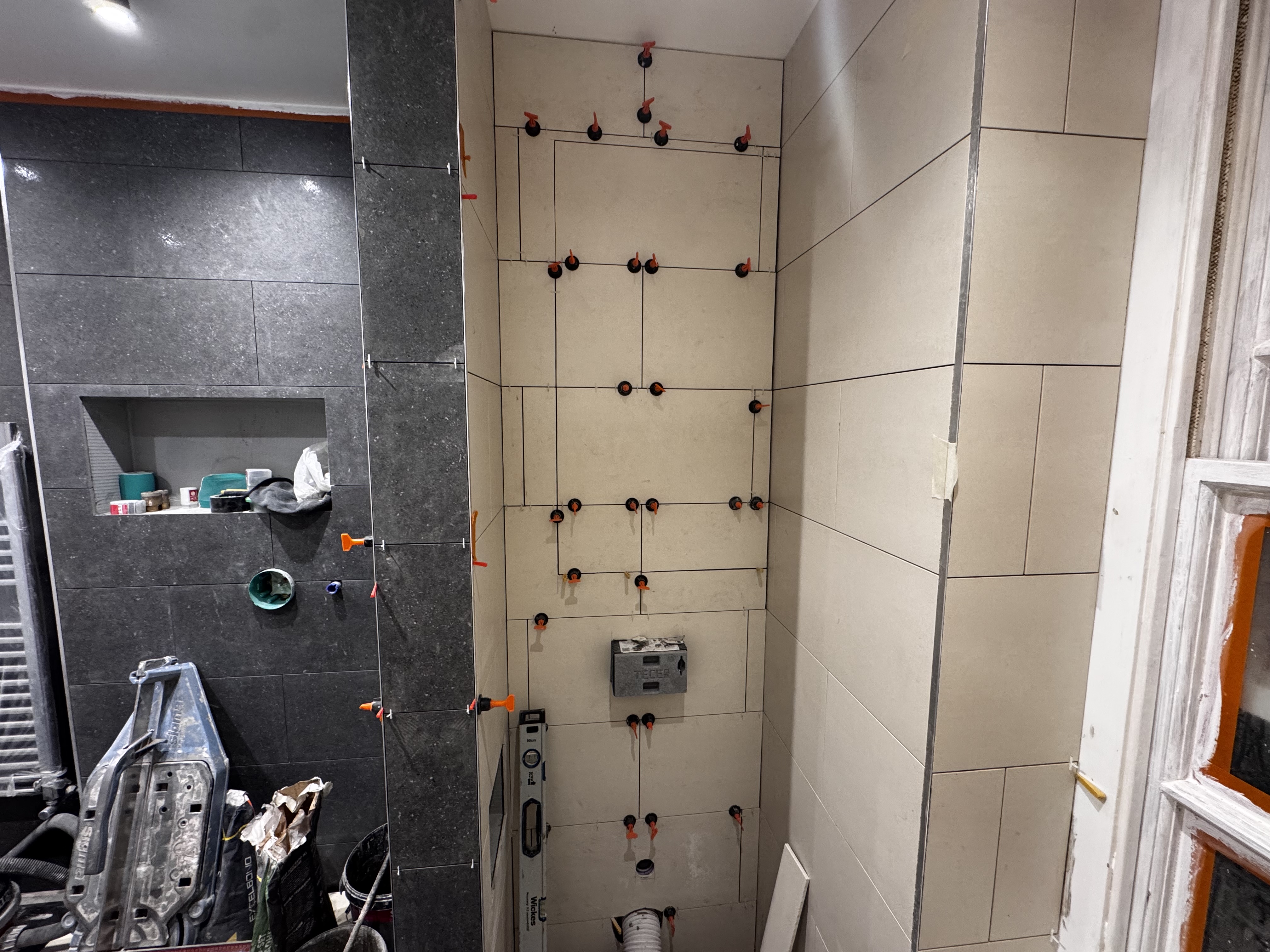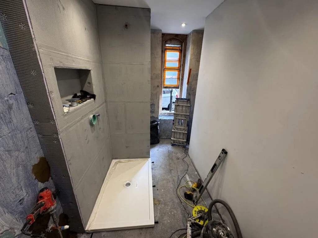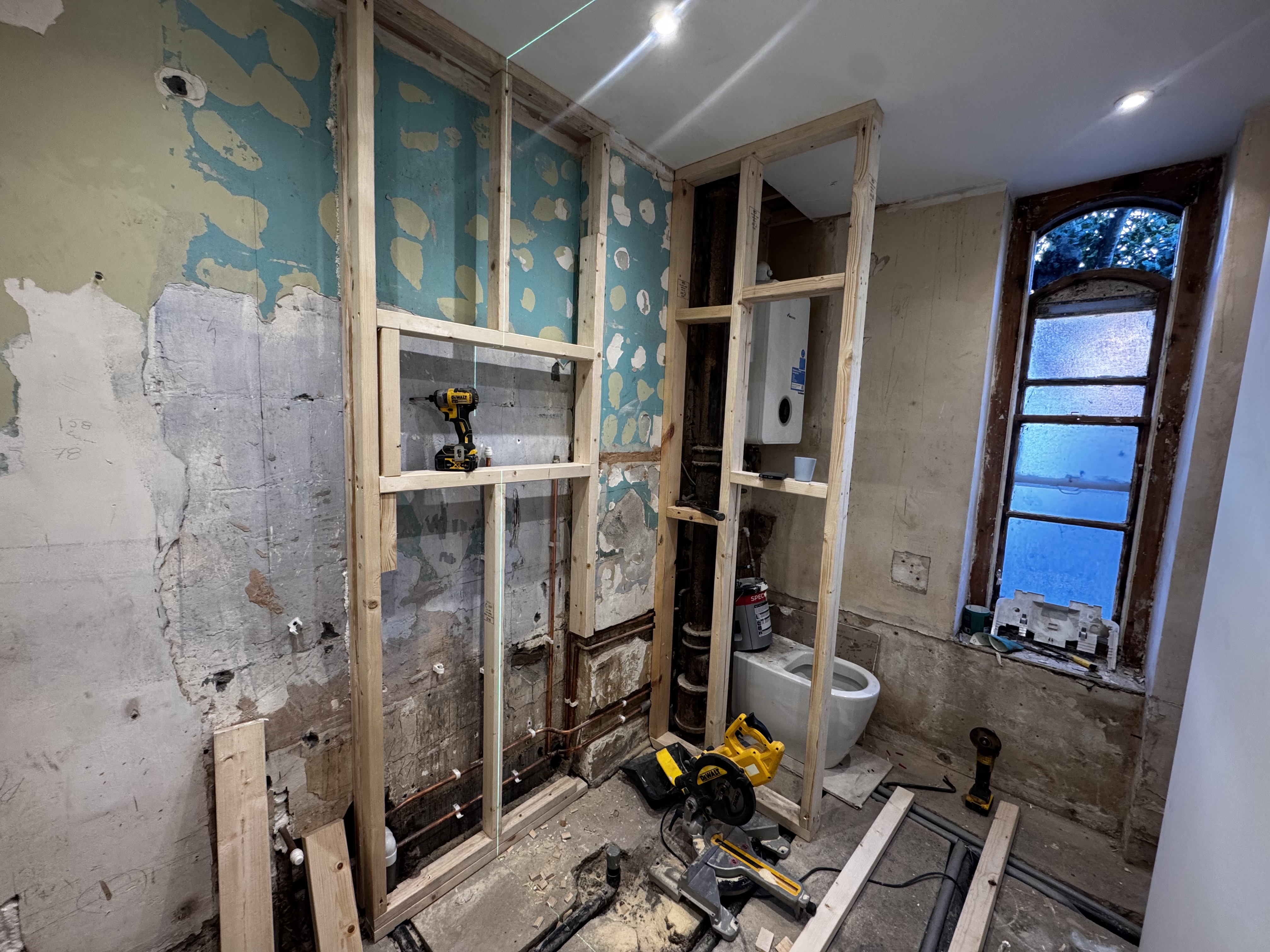 This completed project in October 2025 involved a complete transformation of a dated bathroom into a modern, functional, and stylish space wet room. Our team carried out a full refurbishment, starting with the installation of a new shower area, including a complete replumbing of the system to ensure long-term reliability and improved water pressure. Instead of plasterboard when walls created and expanded, we boarded with JACKOBOARDS before waterproofing completed.