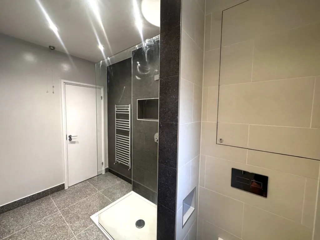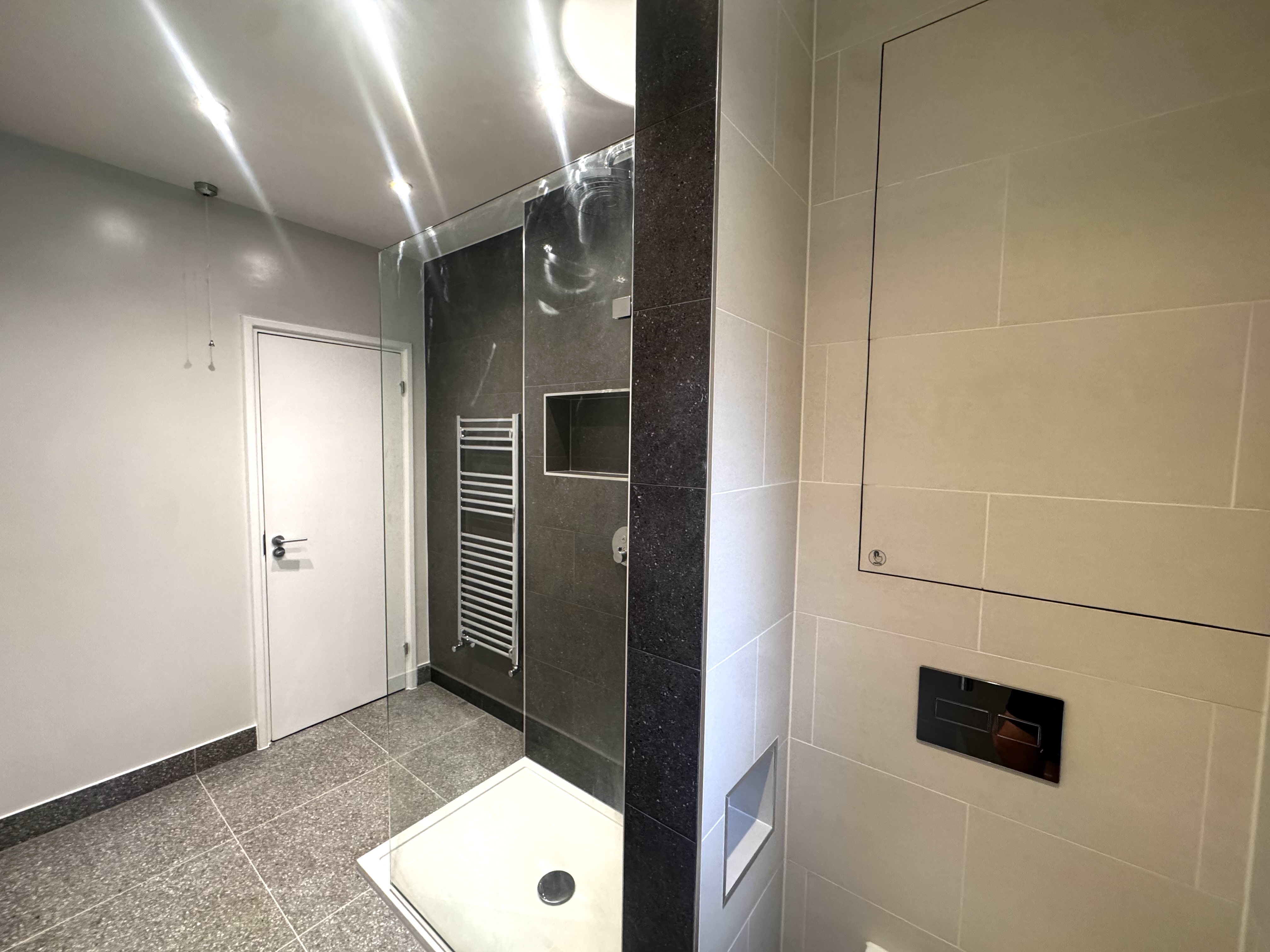 To optimise layout and create a clean, seamless appearance, we built and boxed new walls, incorporating practical recessed niches for storage and aesthetic appeal. A custom-built steel boxing for the existing boiler was created by us also, finished with tiles, easily accessible door for future maintenance.