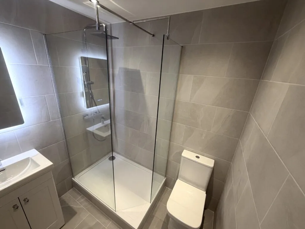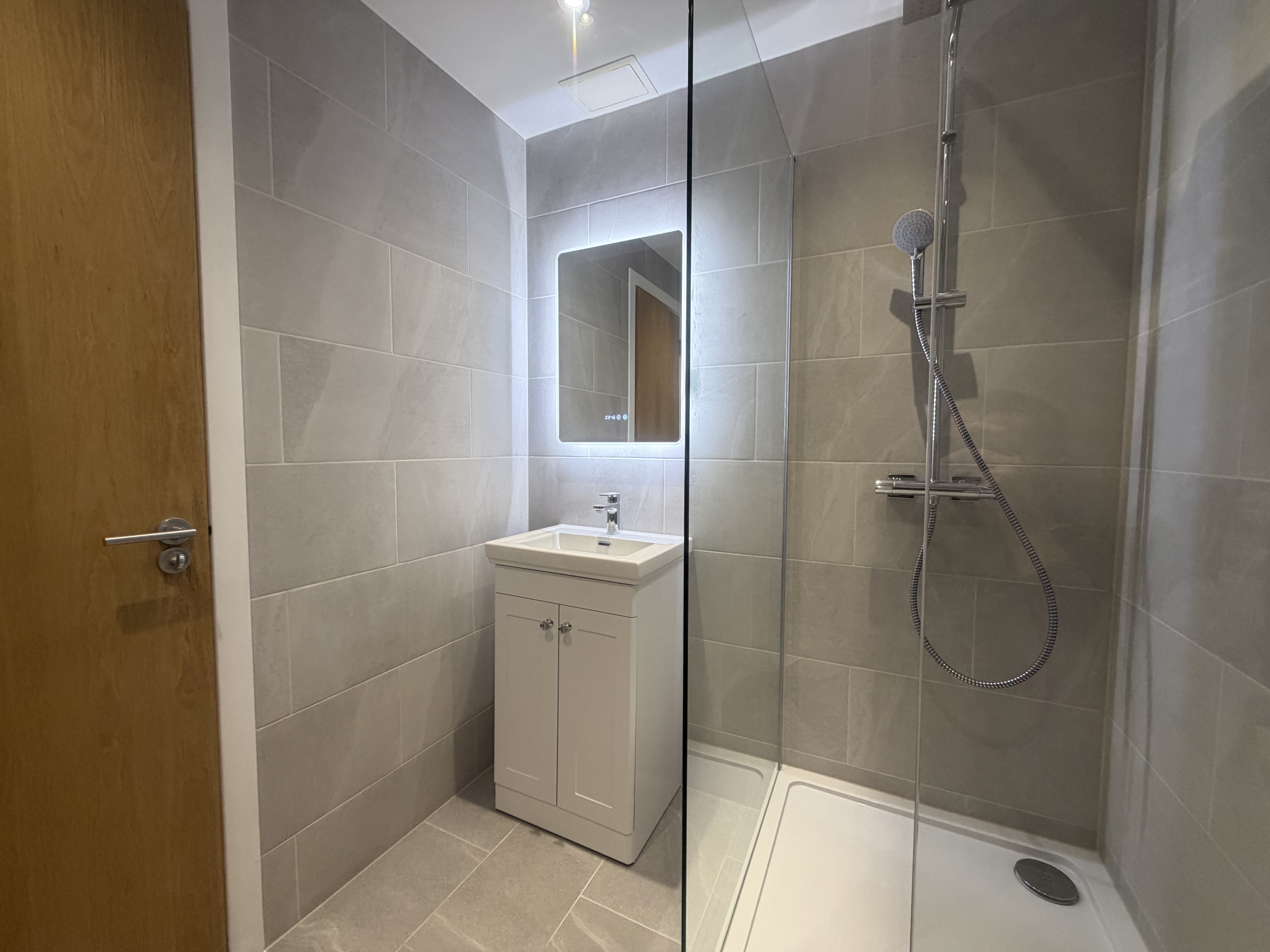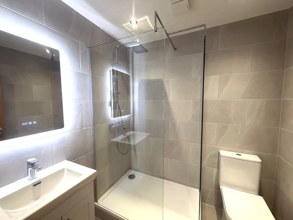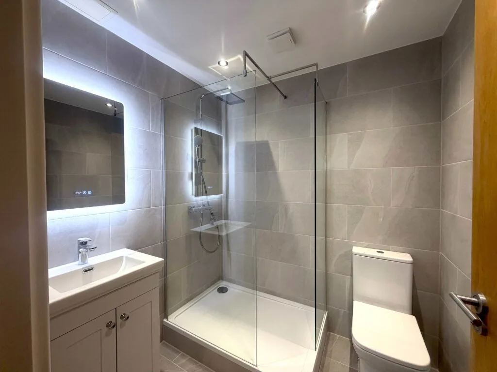 A compact vanity unit with integrated storage was fitted alongside a modern basin and chrome mixer tap. The LED illuminated mirror adds both functionality and a premium touch, while recessed ceiling lighting ensures the space is bright and inviting.