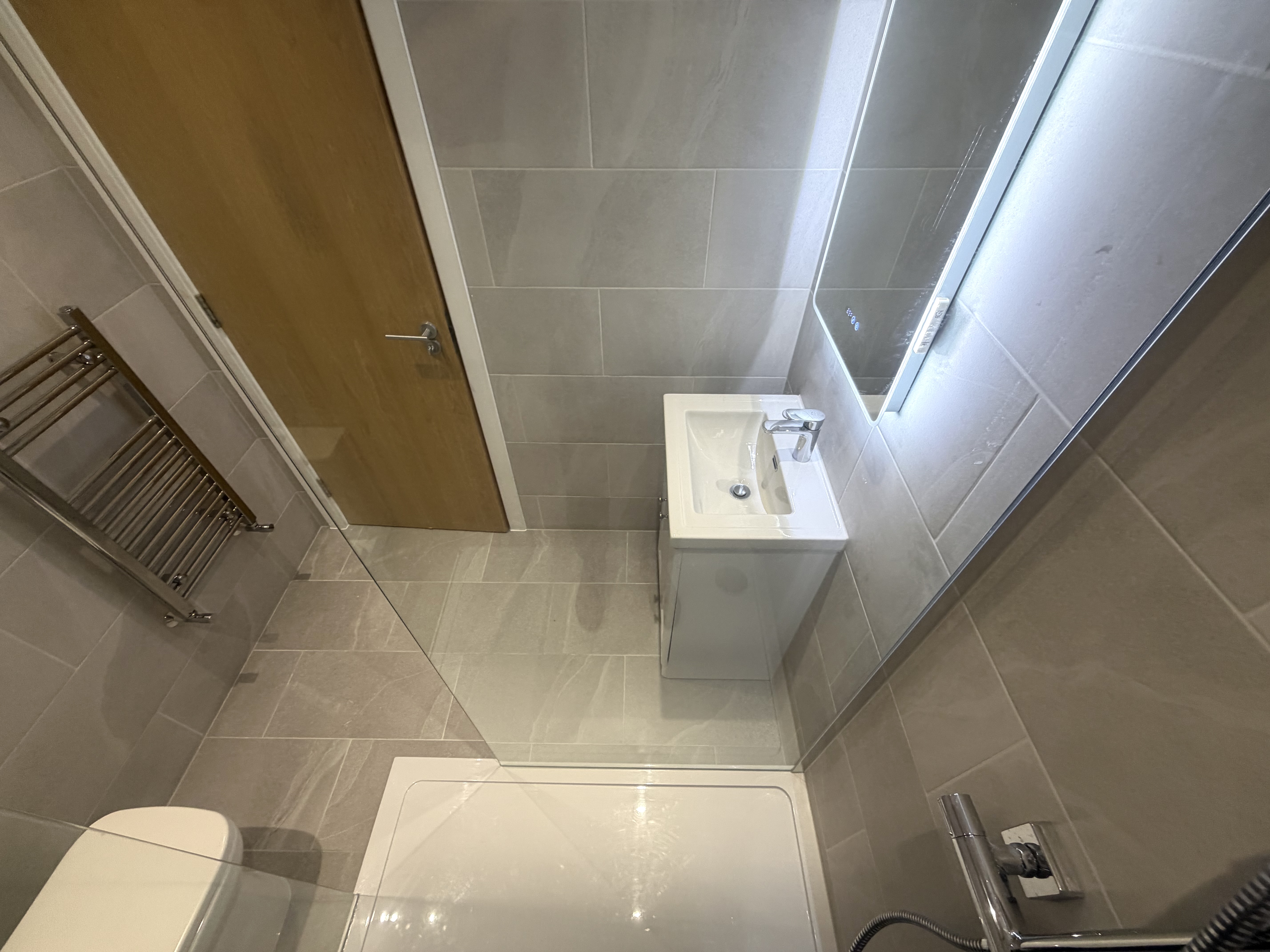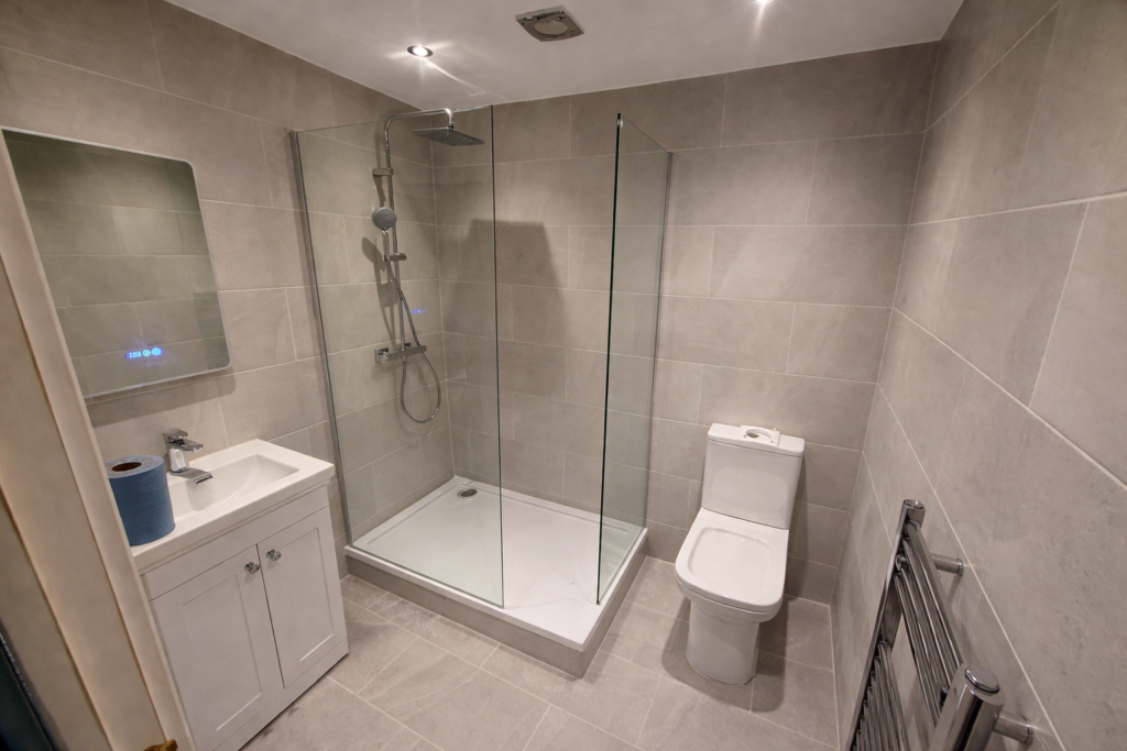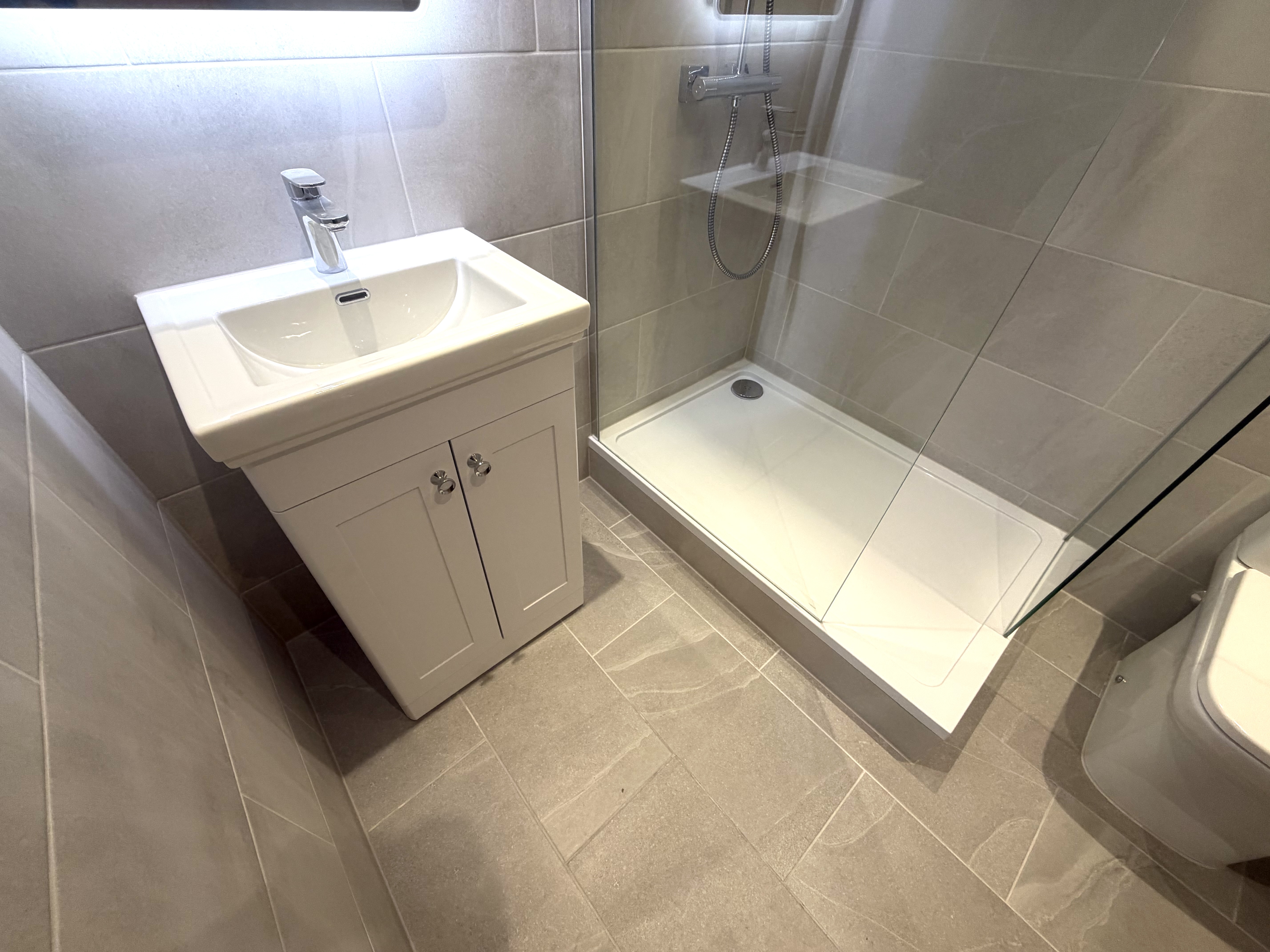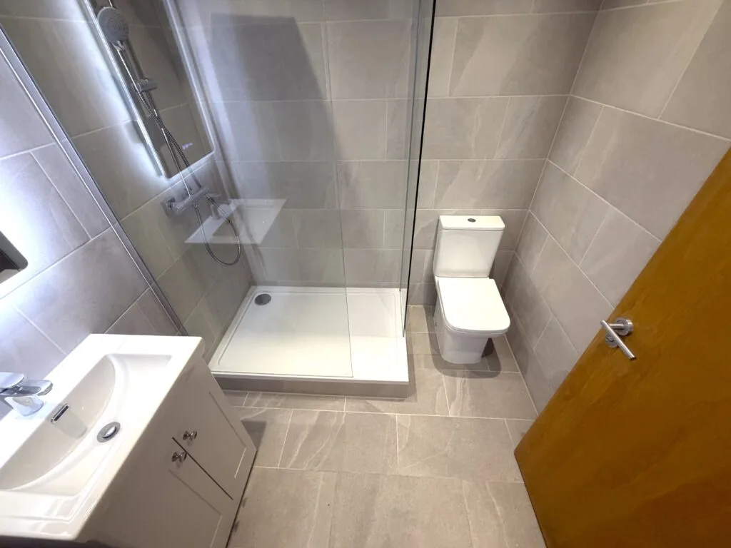 A compact vanity unit with integrated storage was fitted alongside a modern basin and chrome mixer tap. The LED illuminated mirror adds both functionality and a premium touch, while recessed ceiling lighting ensures the space is bright and inviting.