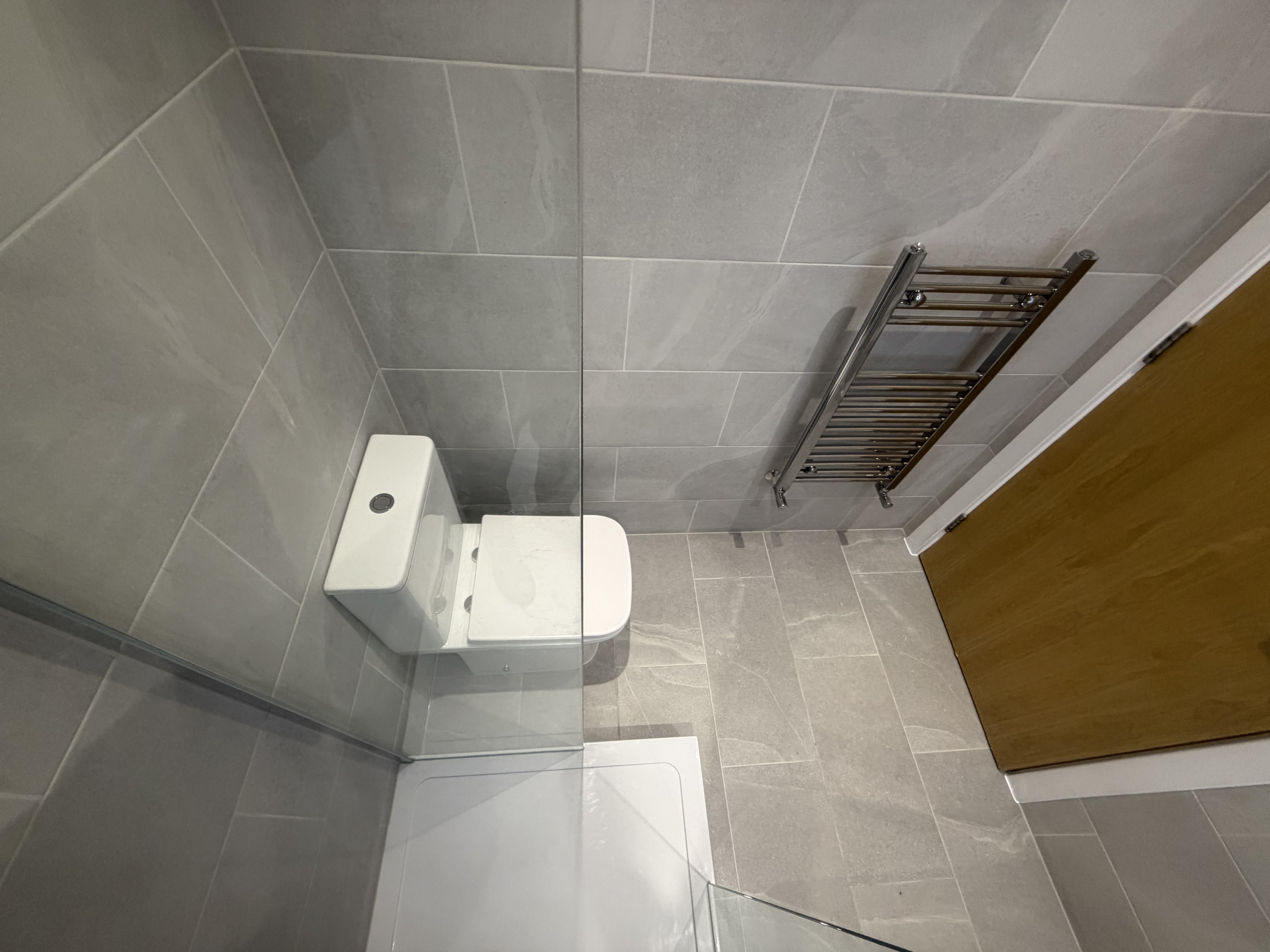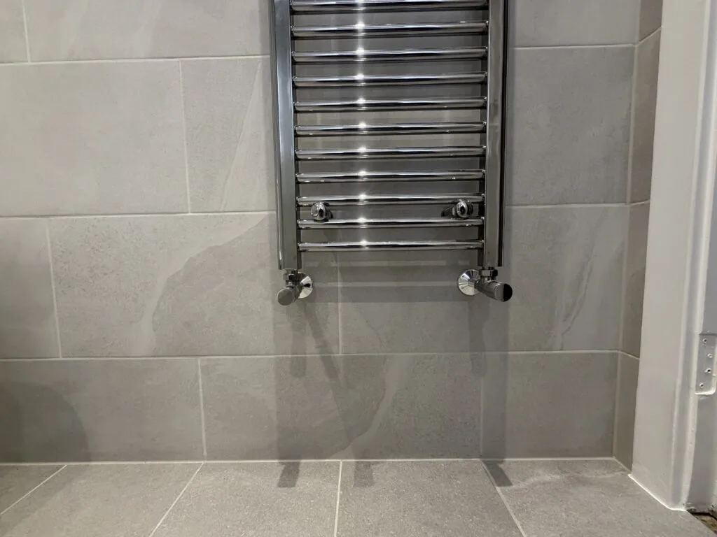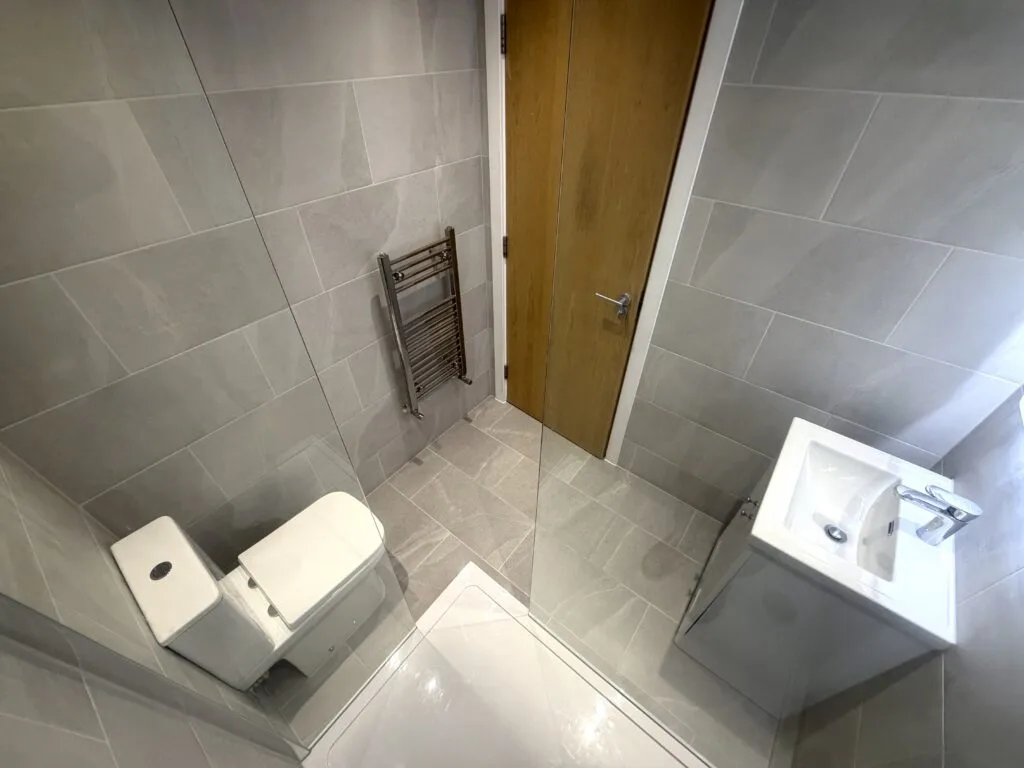 Additional features include a chrome towel radiator, modern WC, and efficient ventilation system bringing a clean, contemporary bathroom that is easy to maintain, highly functional, and visually appealing