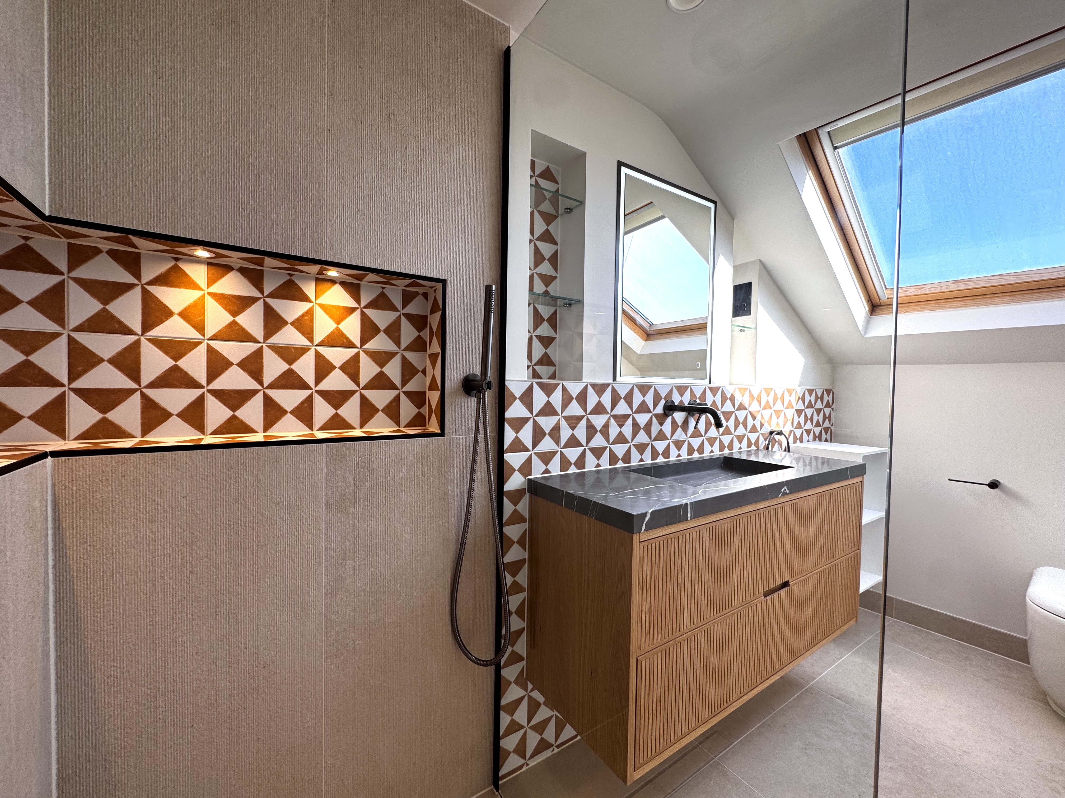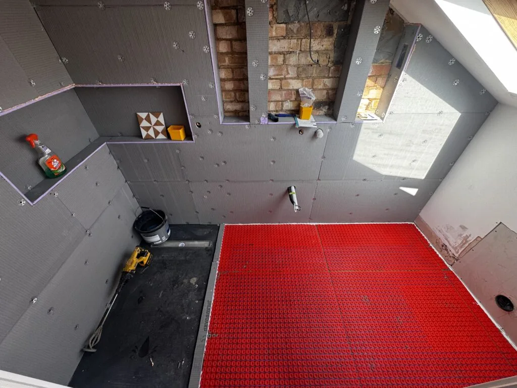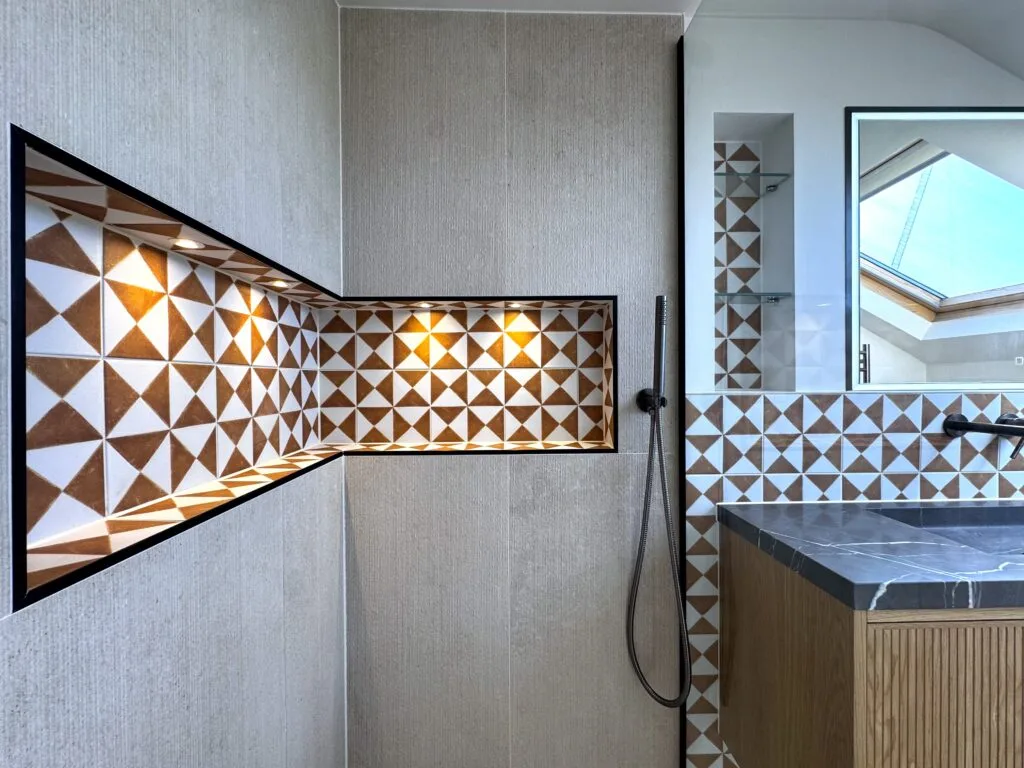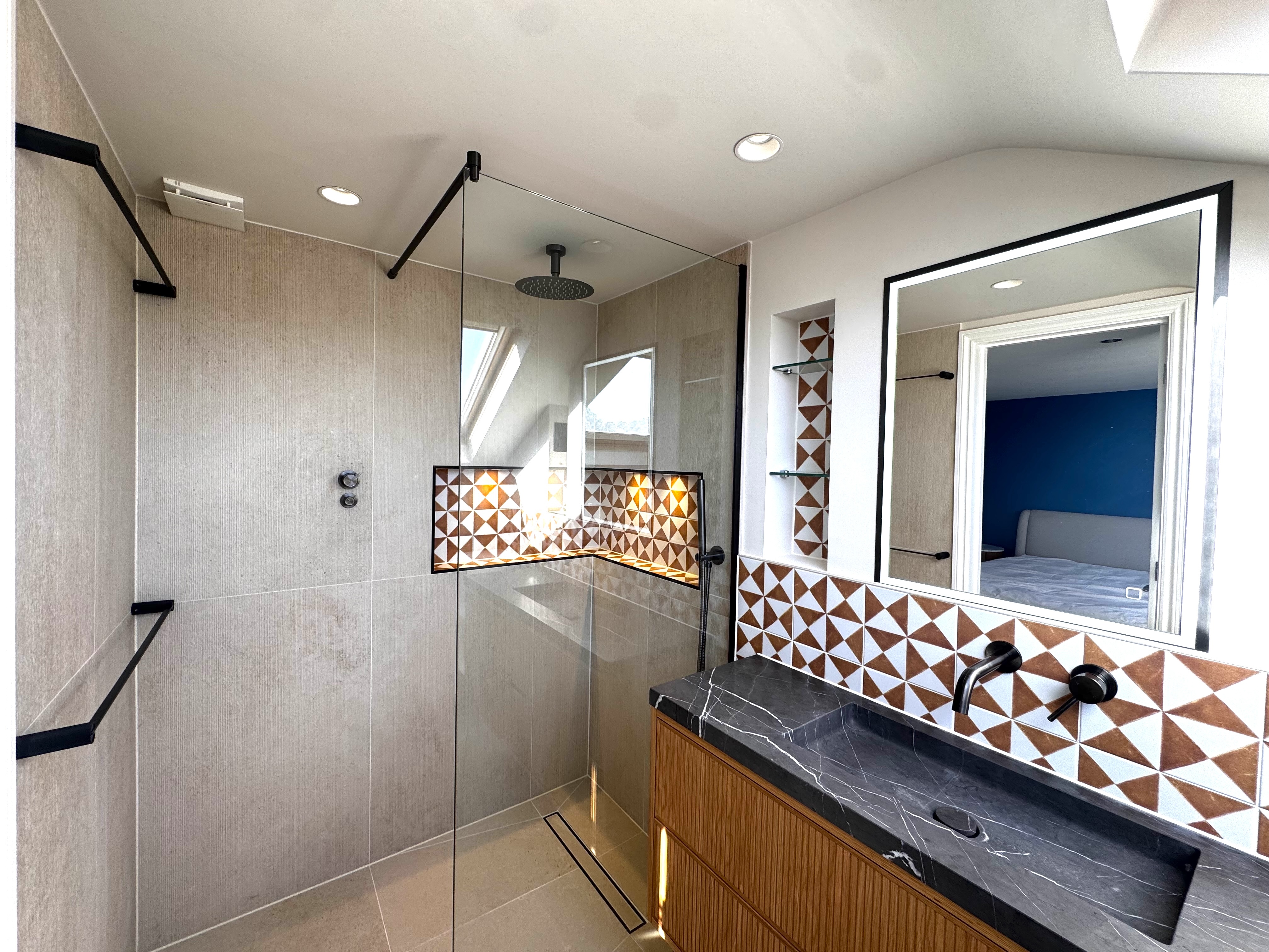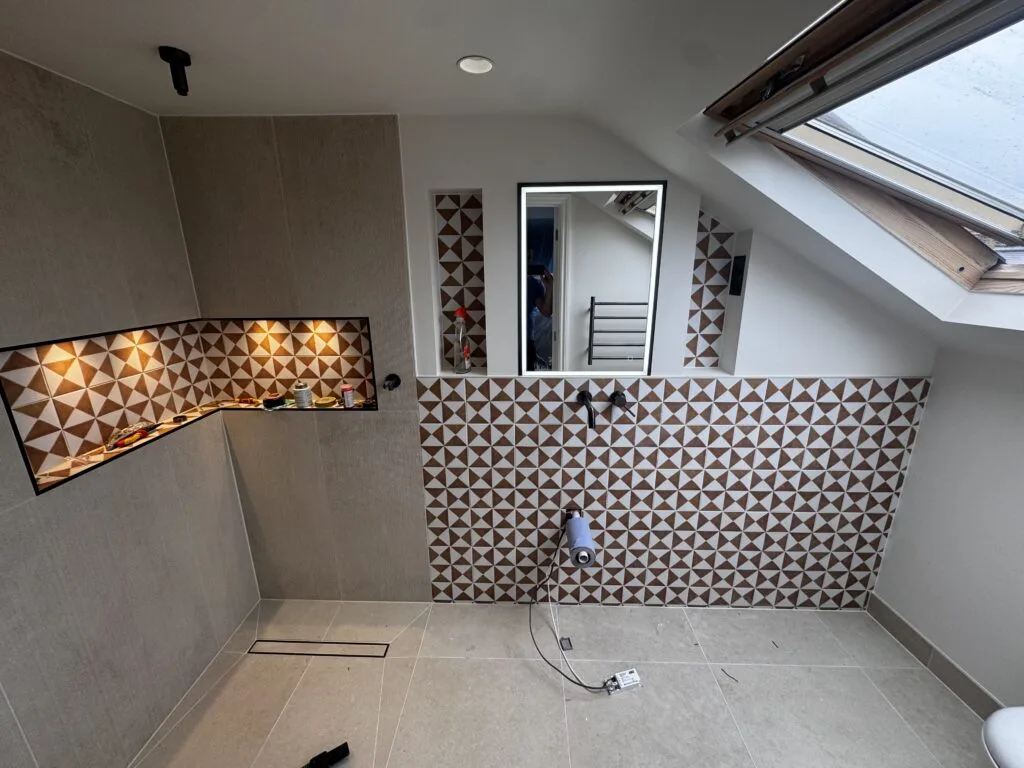 This modern wet room refurbishment in London features a walk-in shower, underfloor heating, stylish vanity, built-in mirror, bespoke wall niches, and elegant lighting. Designed for comfort and luxury with a perfect blend of modern materials and craftsmanship.