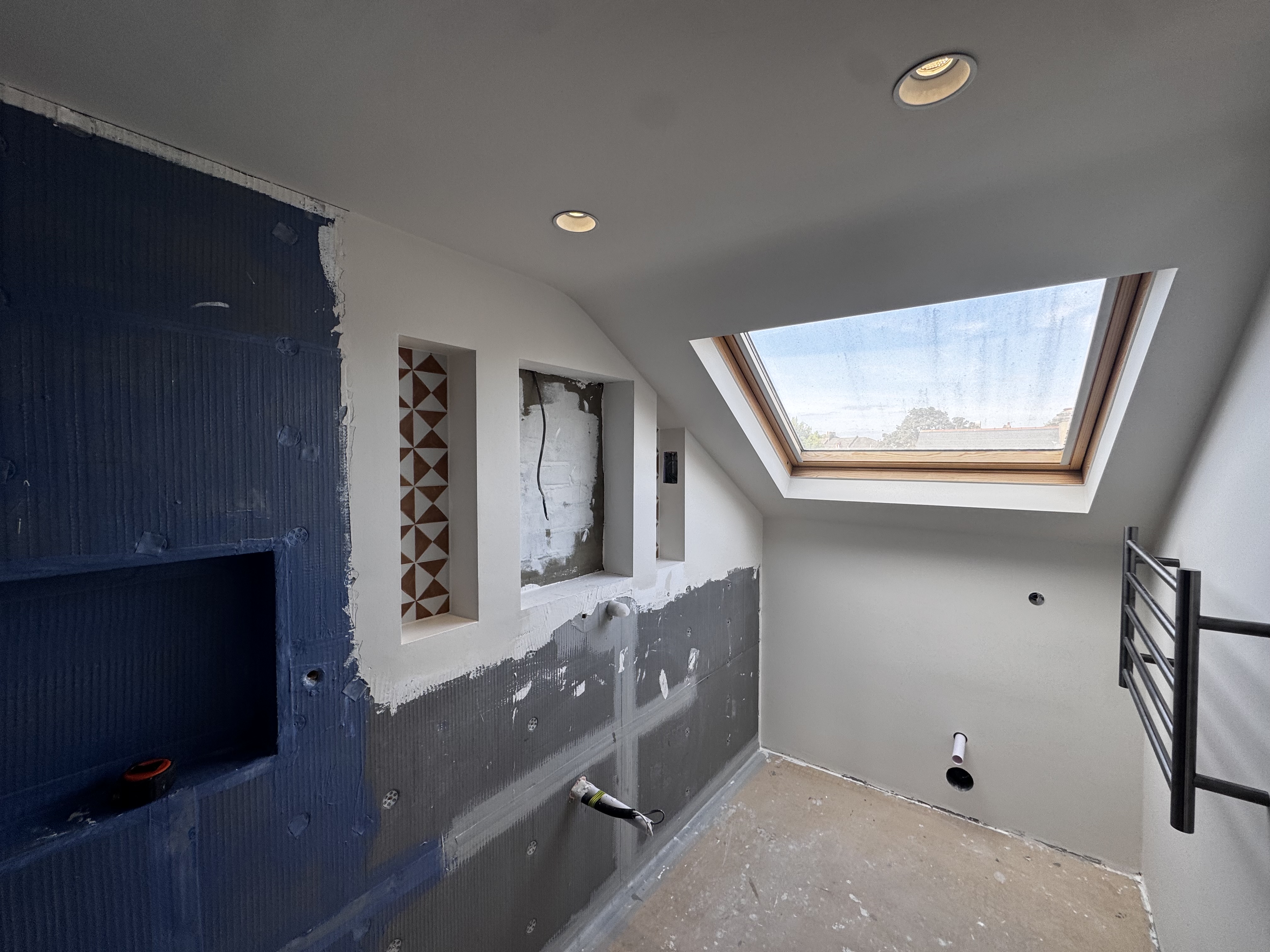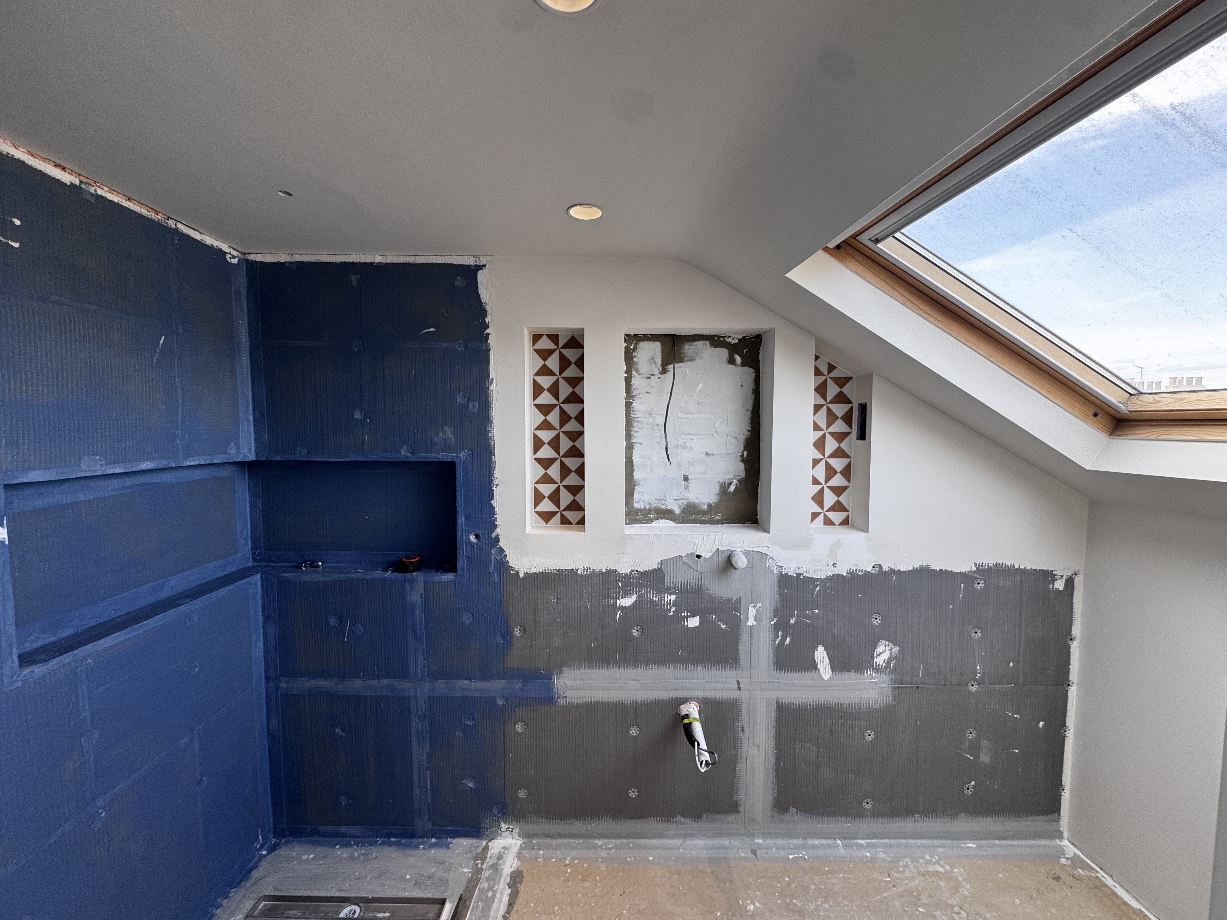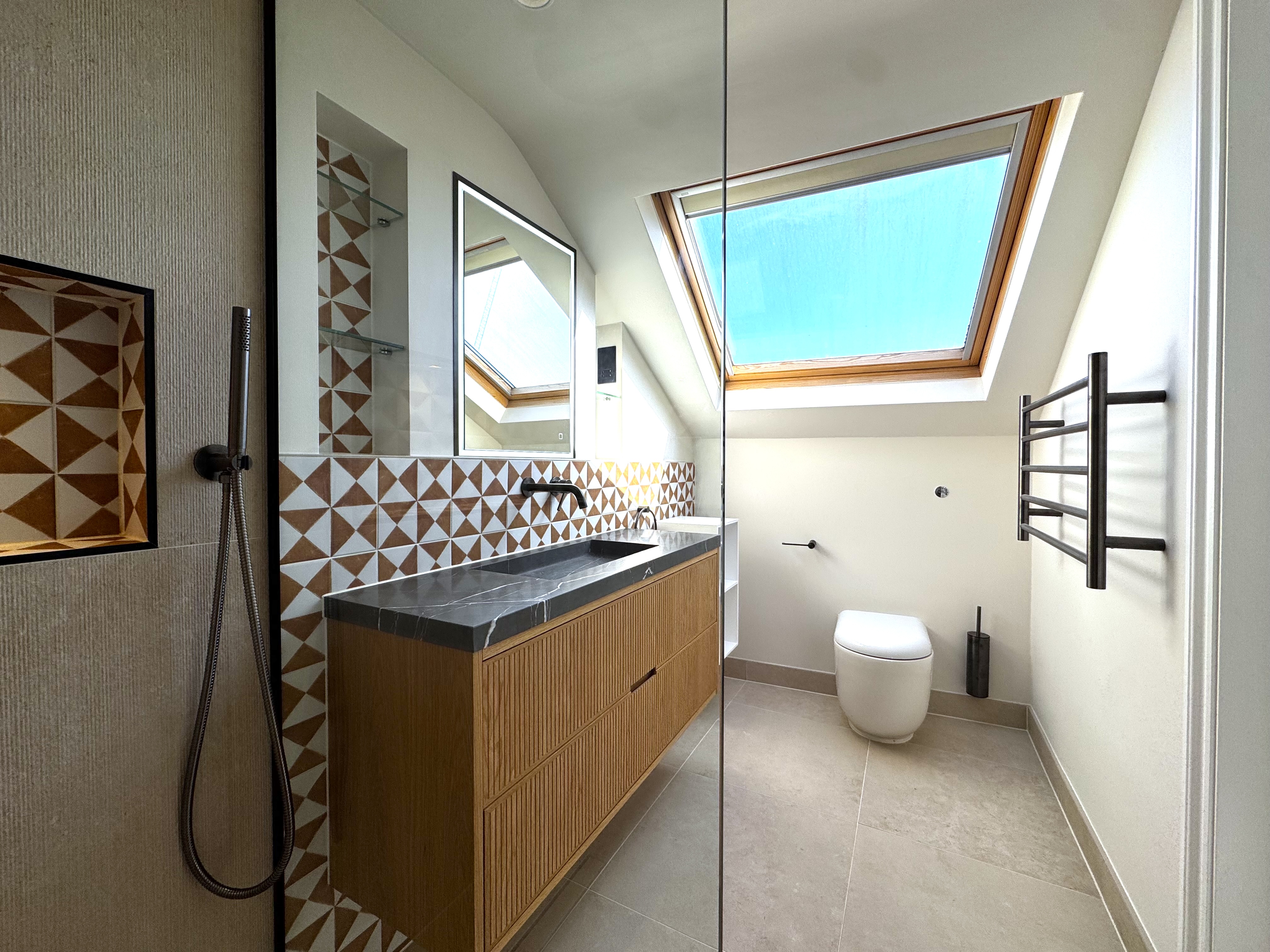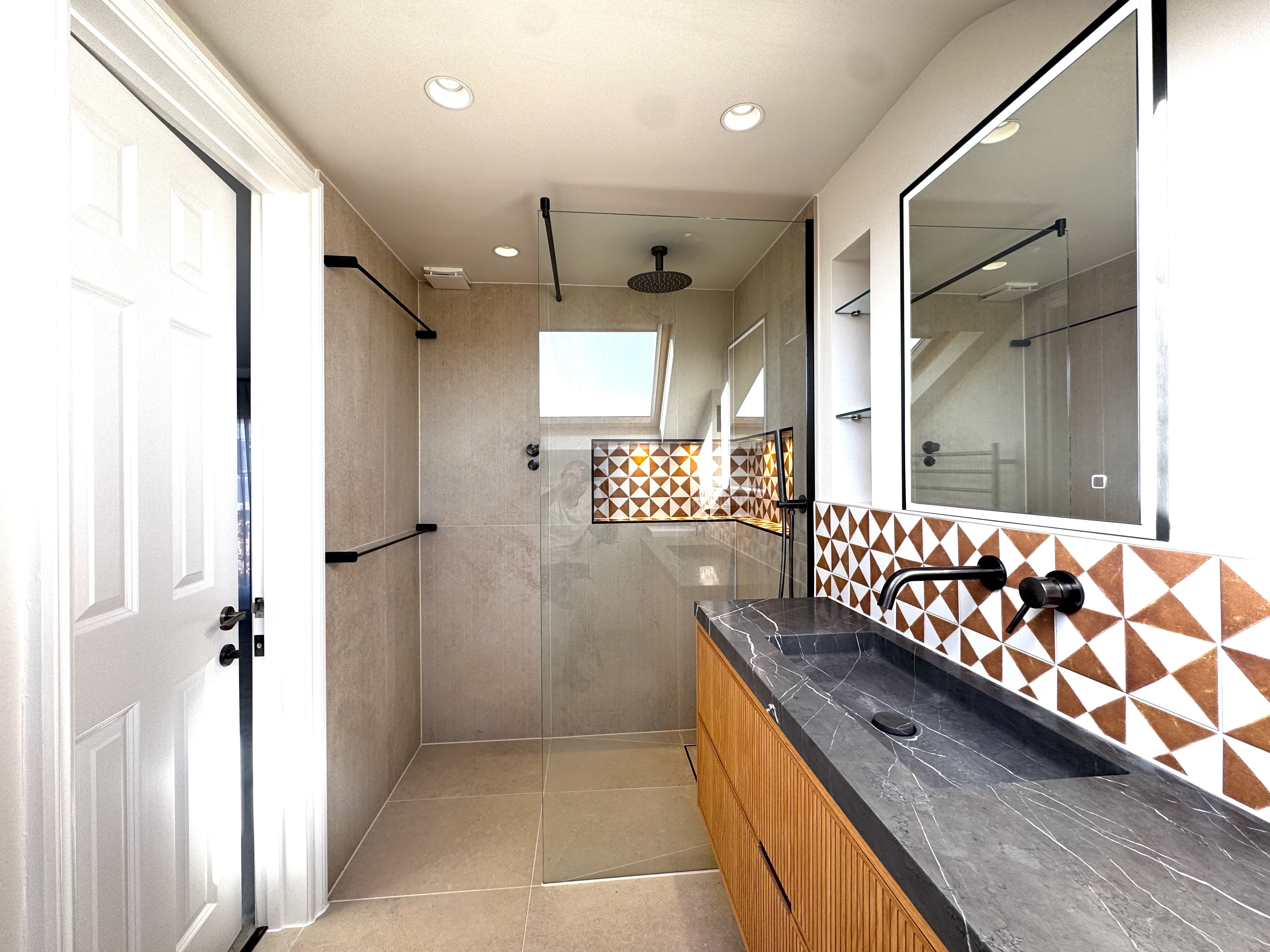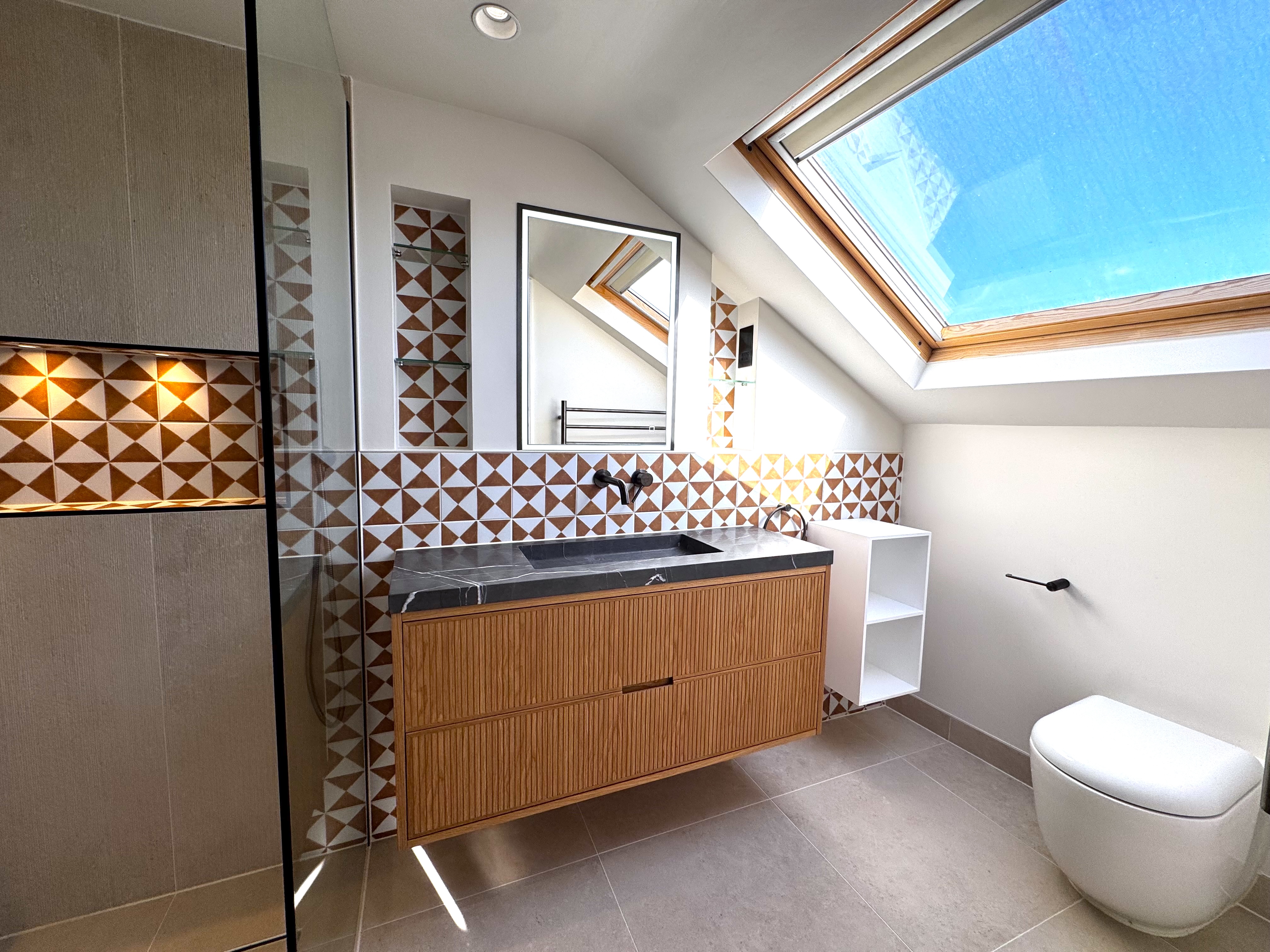 This modern wet room refurbishment in London features a walk-in shower, underfloor heating, stylish vanity, built-in mirror, bespoke wall niches, and elegant lighting. Designed for comfort and luxury with a perfect blend of modern materials and craftsmanship.
