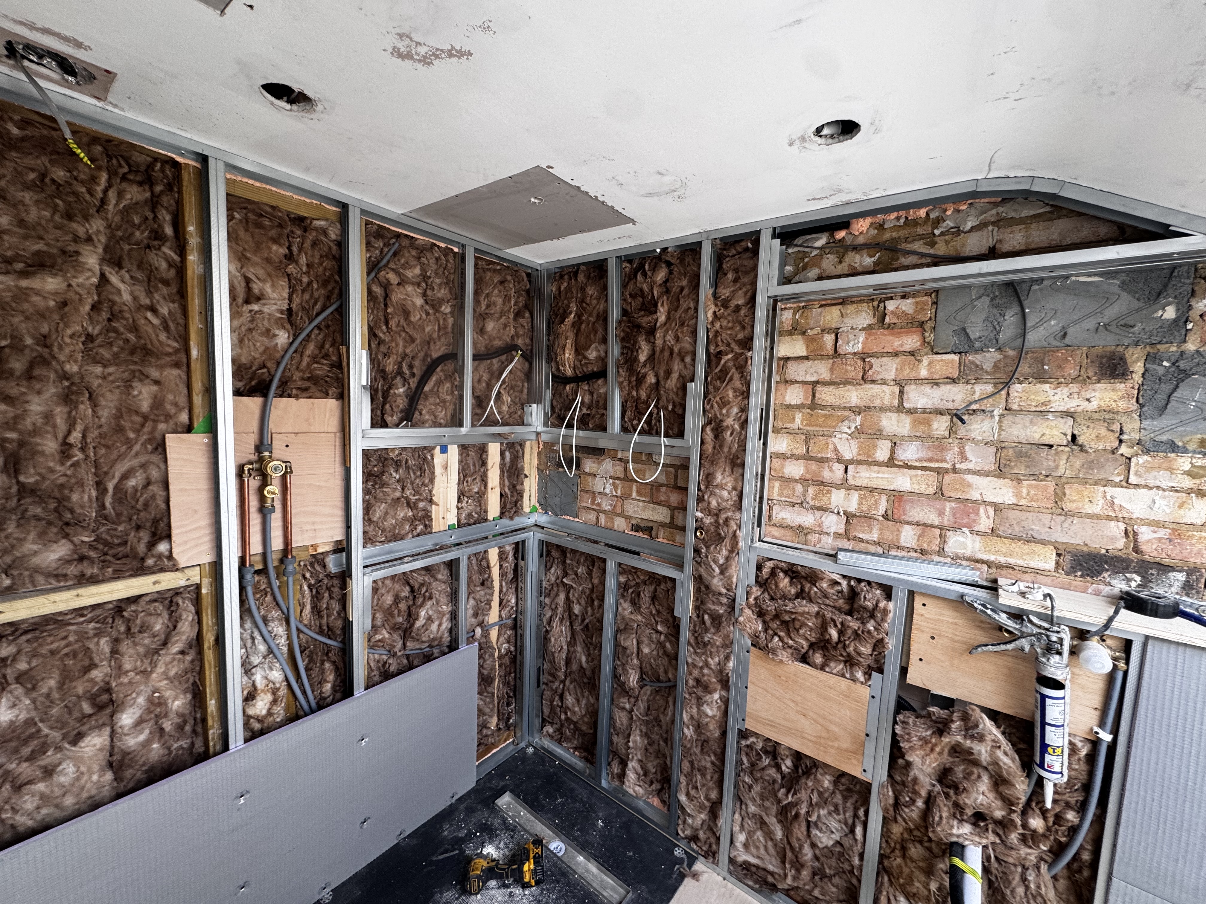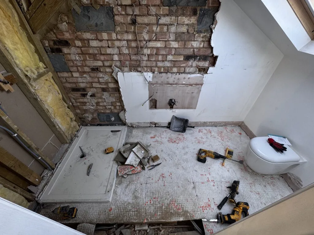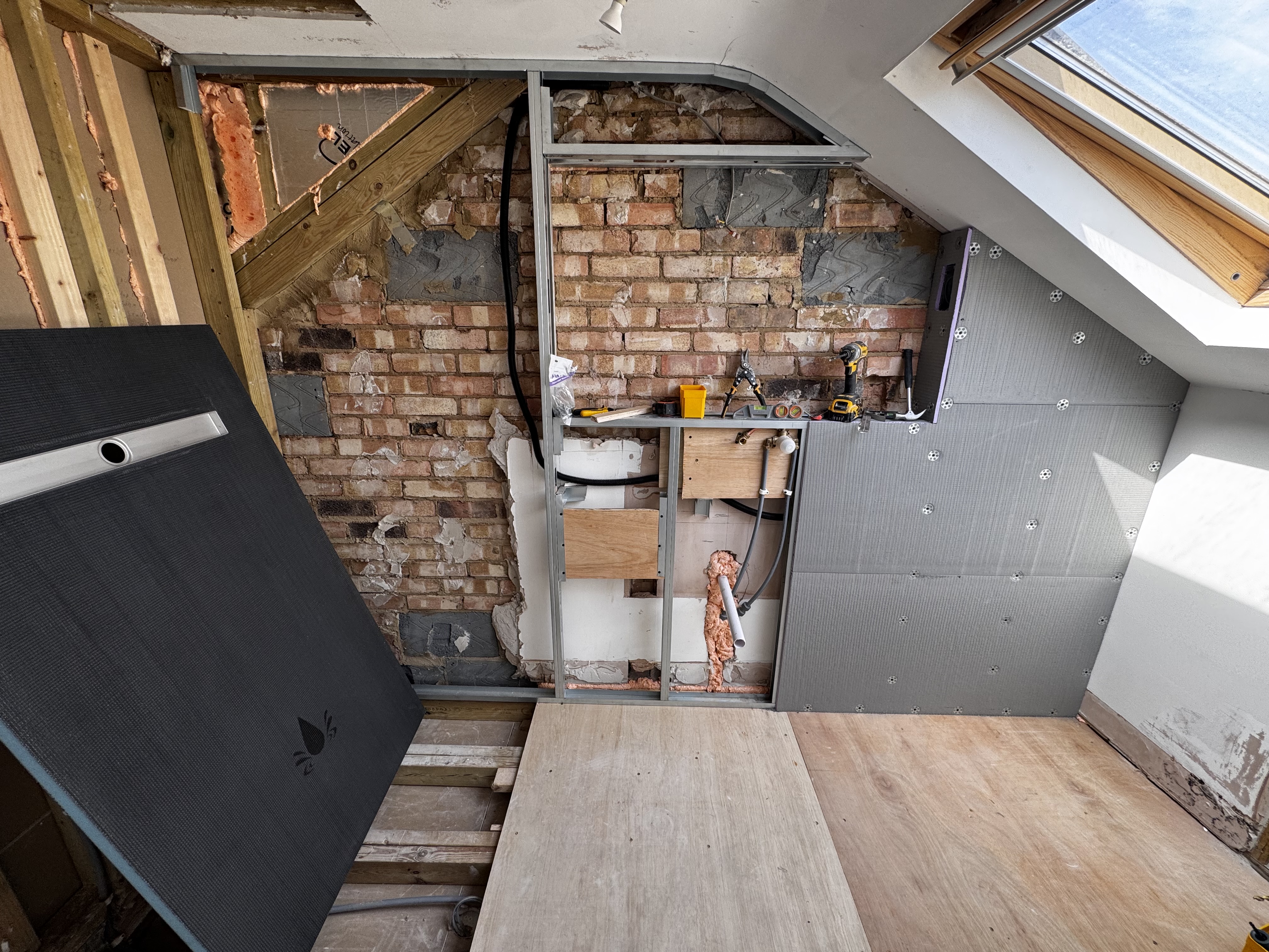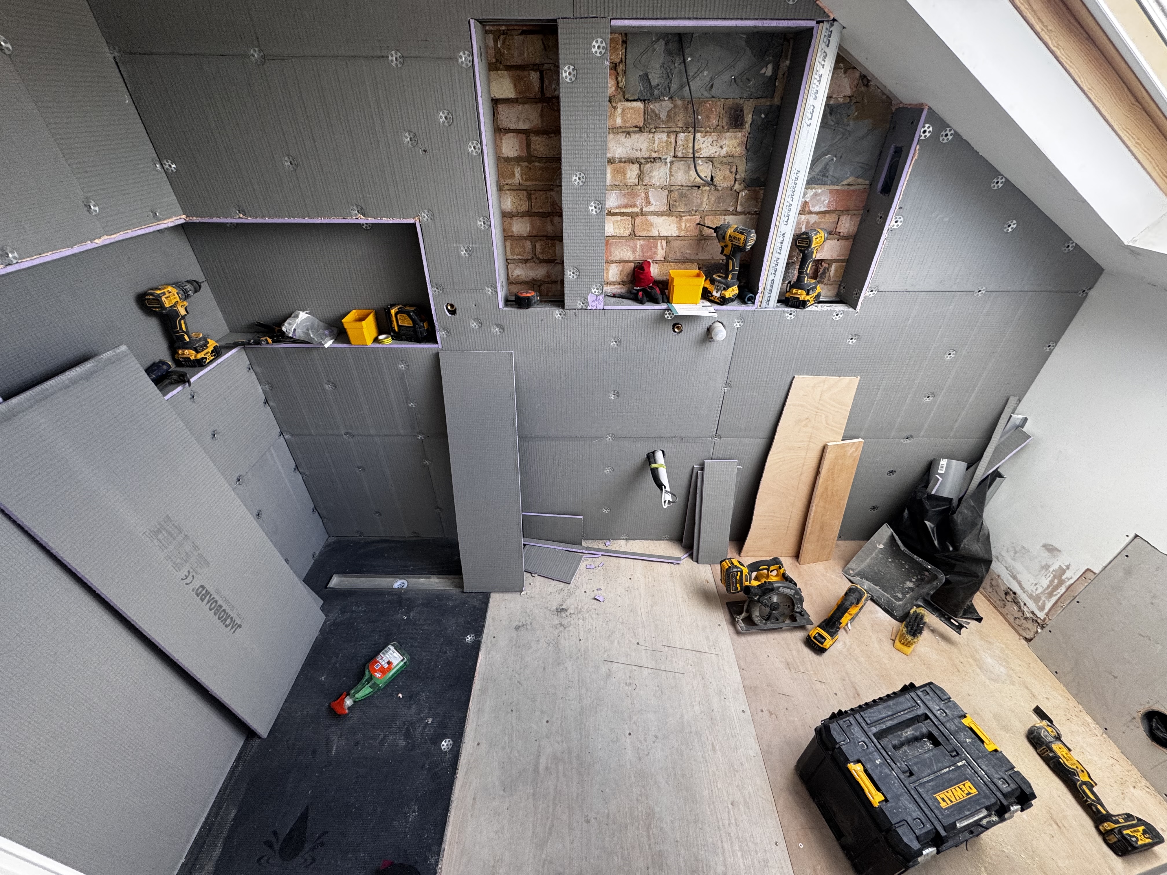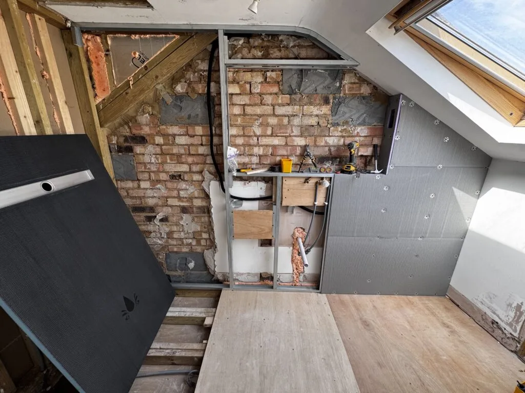 This modern wet room refurbishment in London features a walk-in shower, underfloor heating, stylish vanity, built-in mirror, bespoke wall niches, and elegant lighting. Designed for comfort and luxury with a perfect blend of modern materials and craftsmanship.