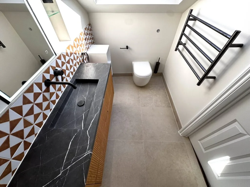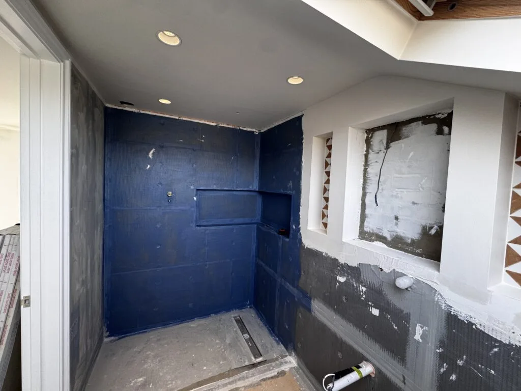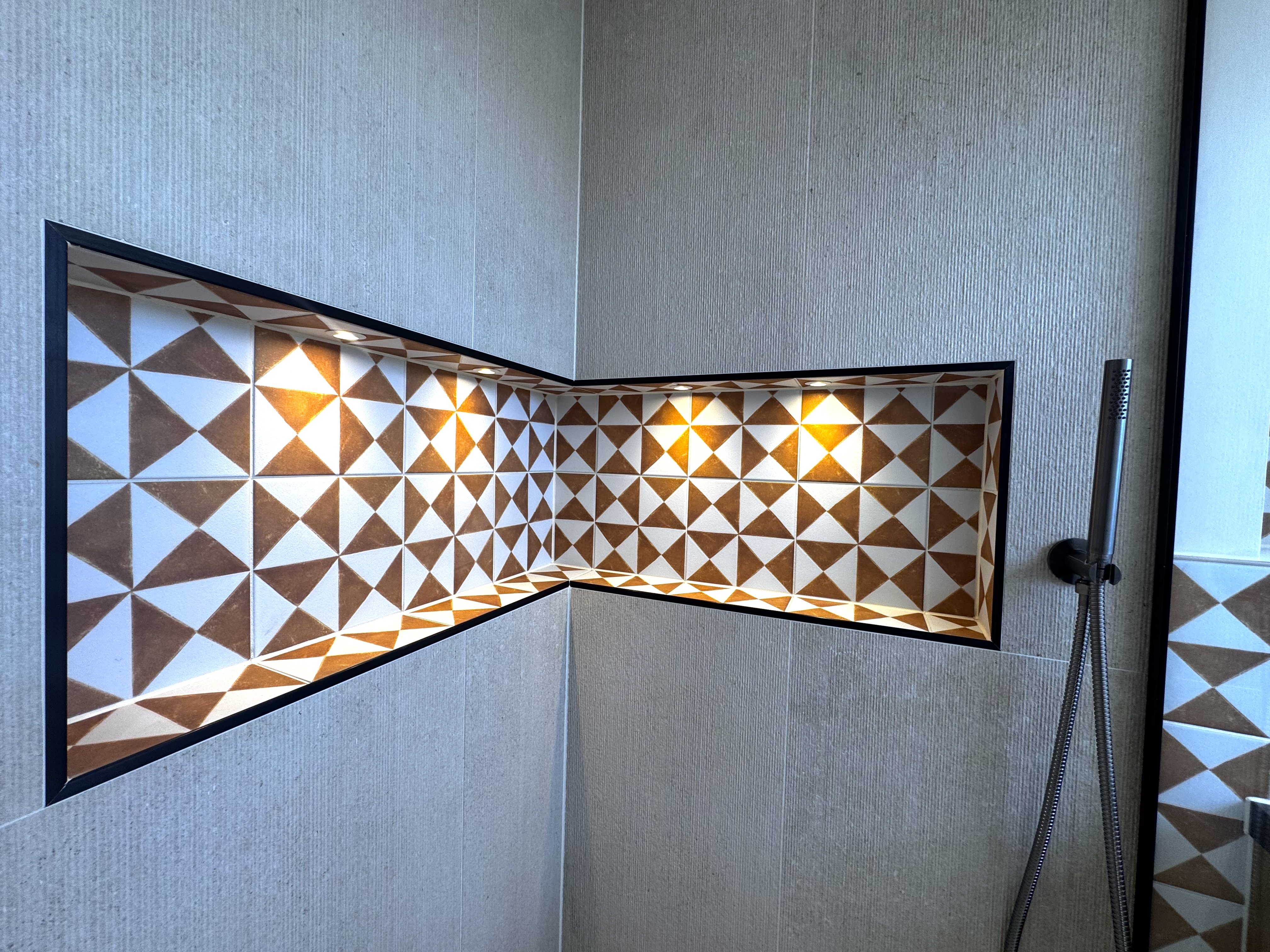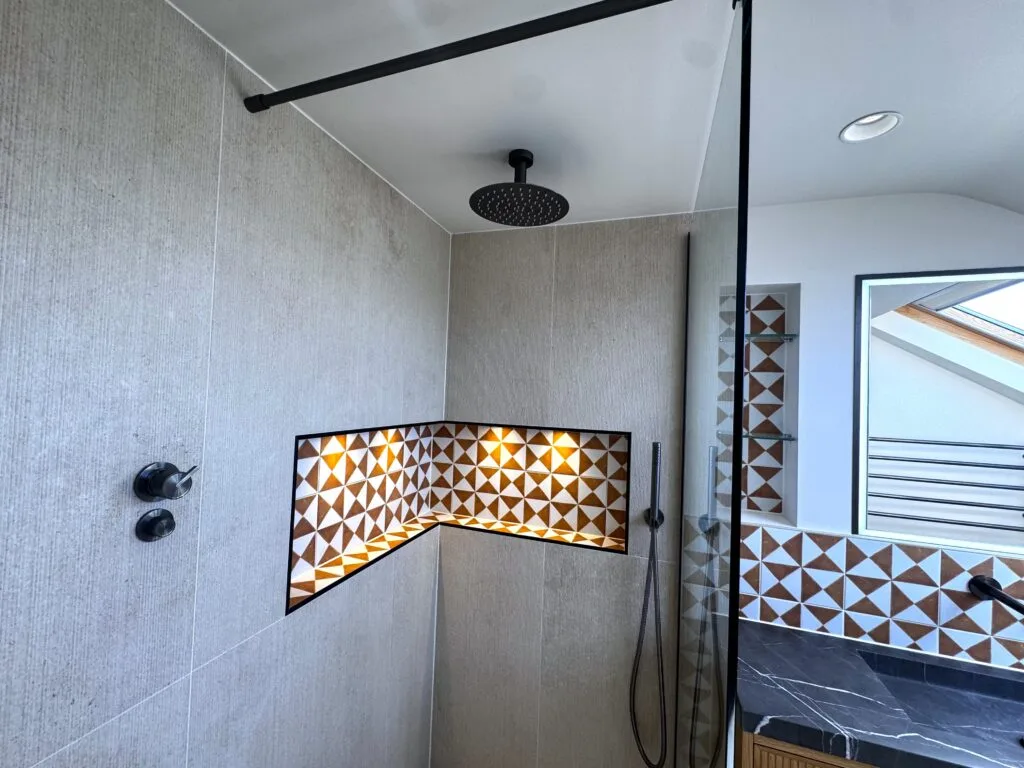 The room is finished with a combination of premium tiles that bring contrast and depth to the space, while custom-built niches and glass shelving offer both functionality and refined aesthetic appeal.