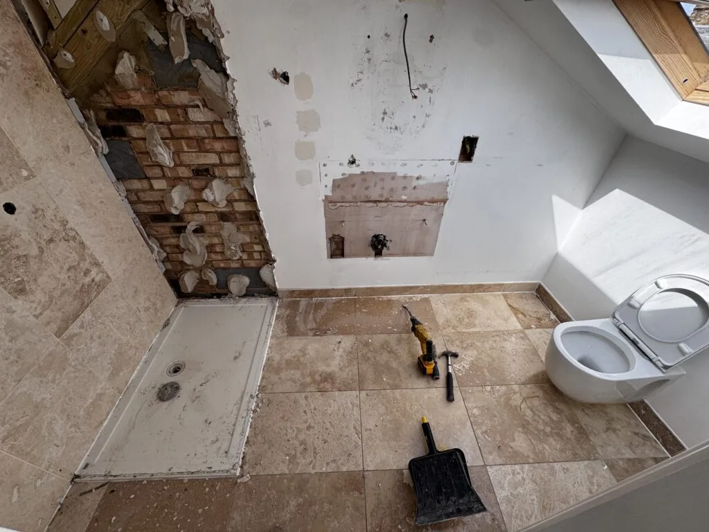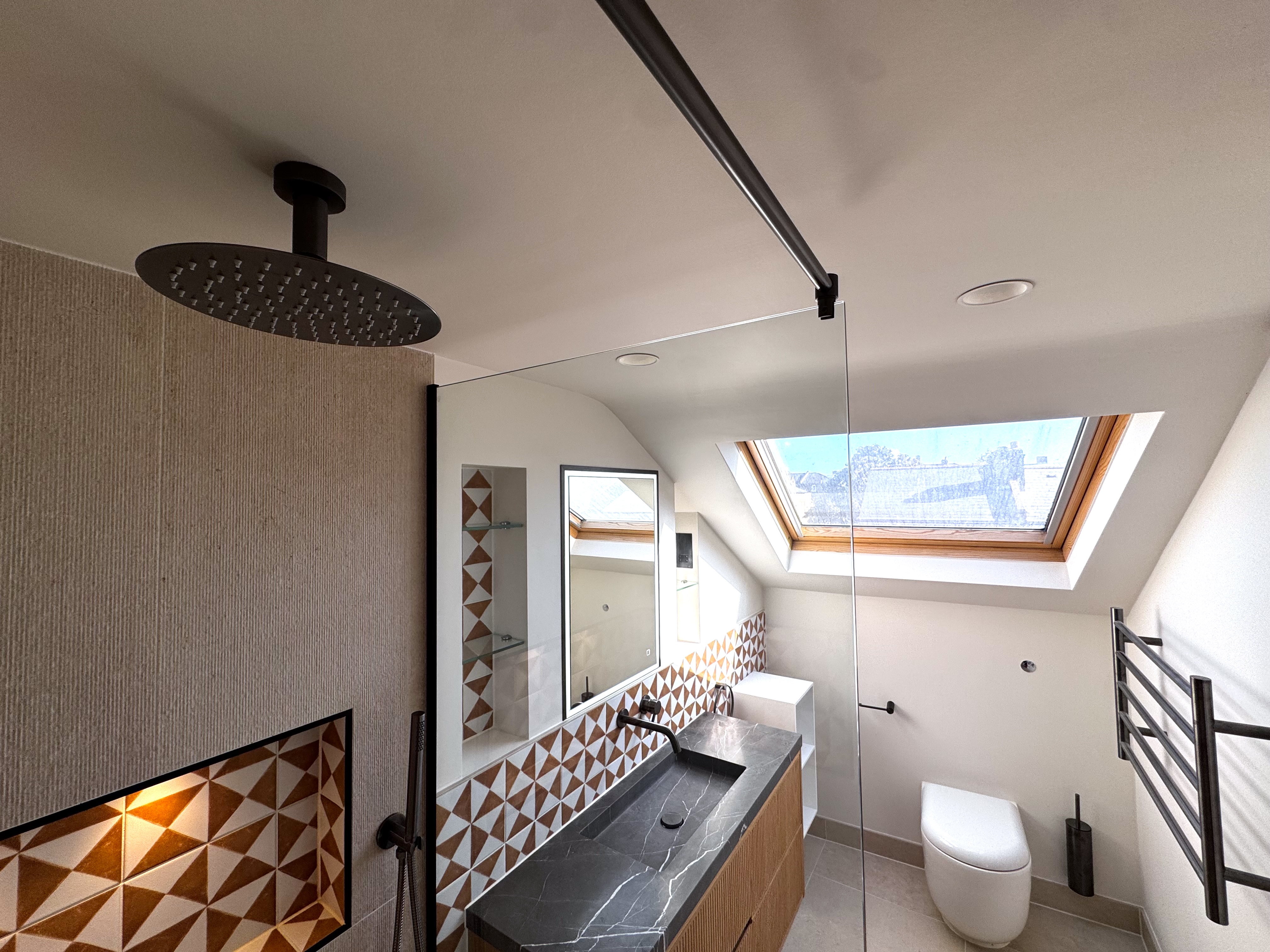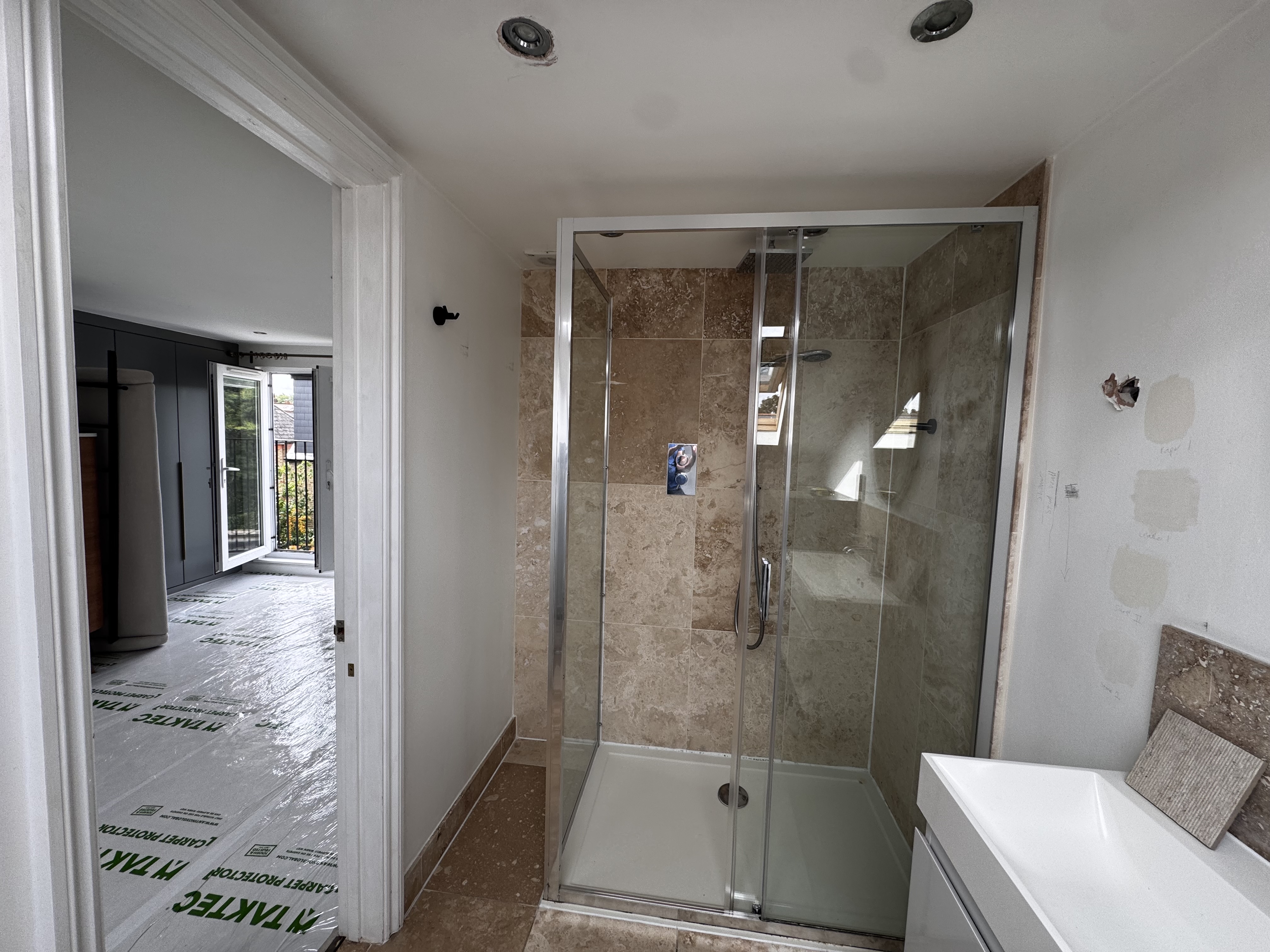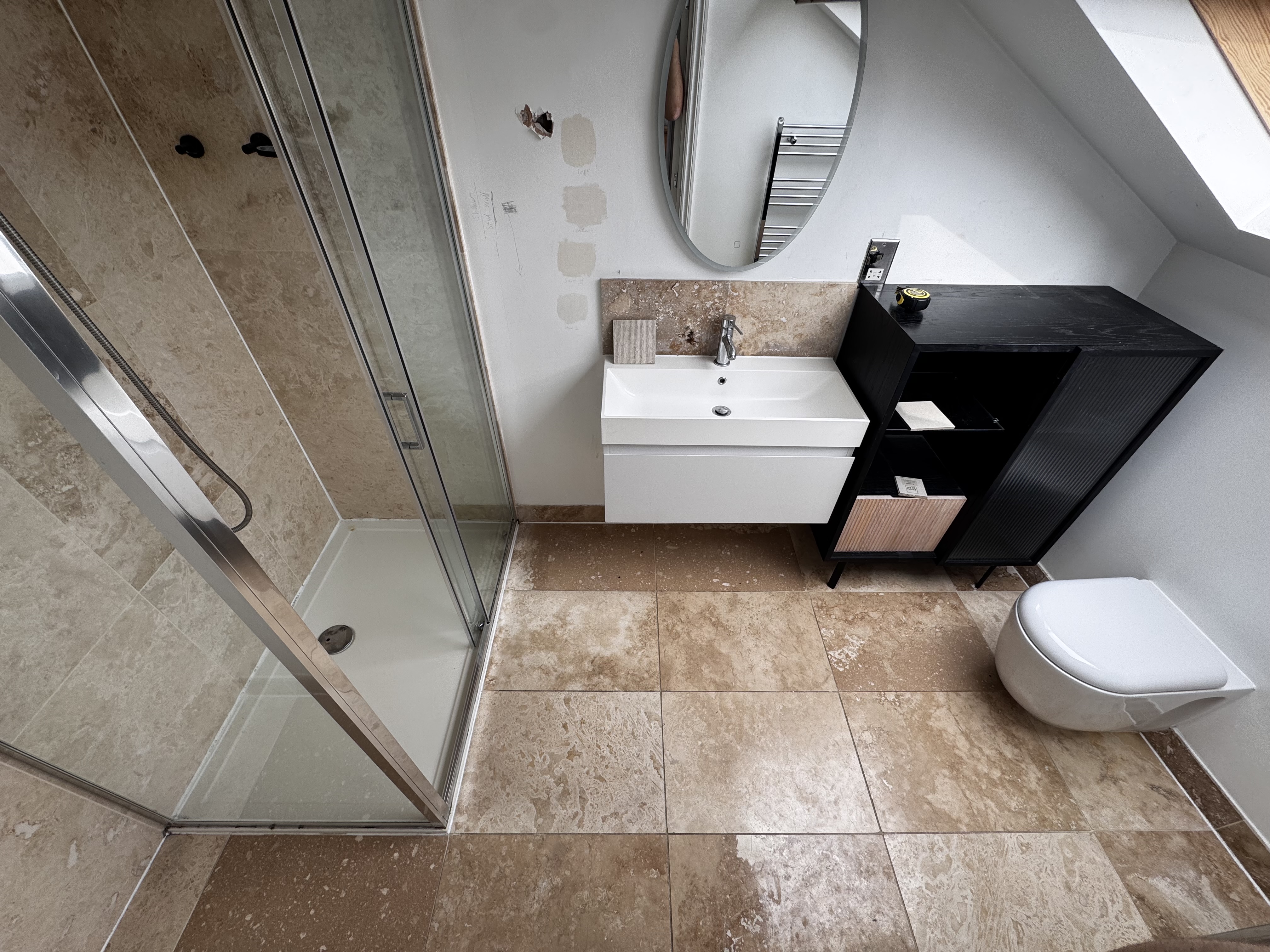 This stunning modern wet room refurbishment showcases the perfect combination of elegance, comfort, and practicality (completed August 2025).The project features a walk-in shower area with a sleek glass screen, a contemporary wall-mounted toilet, and a stylish vanity unit with storages— all designed to maximise space and create a seamless, modern look.