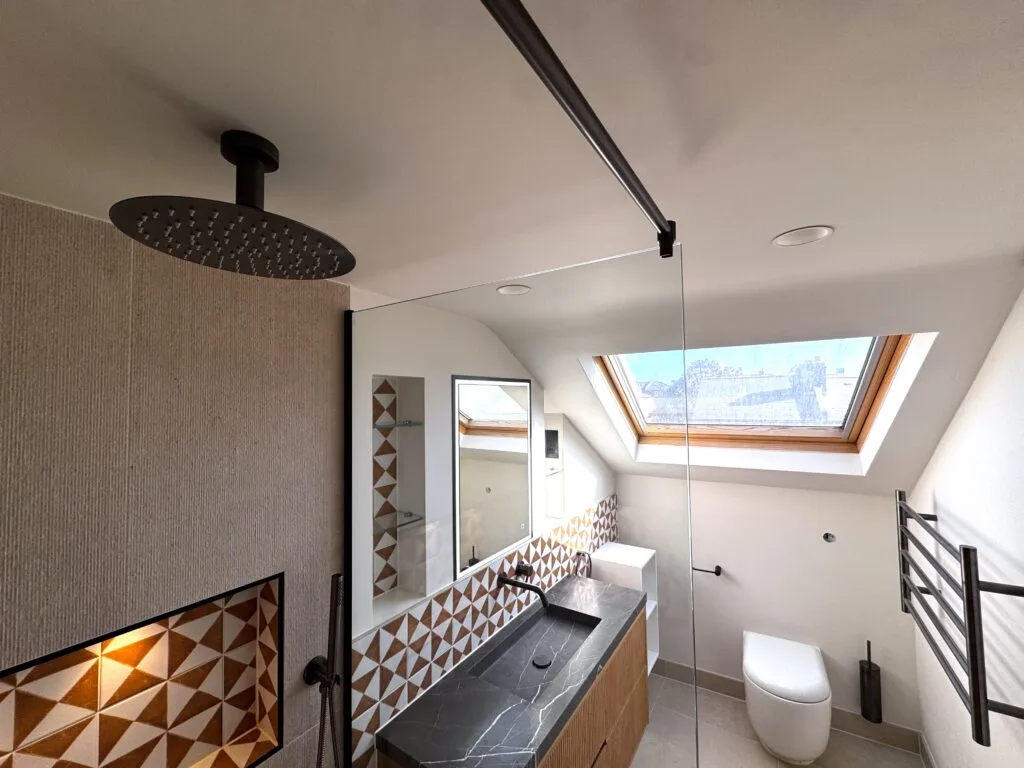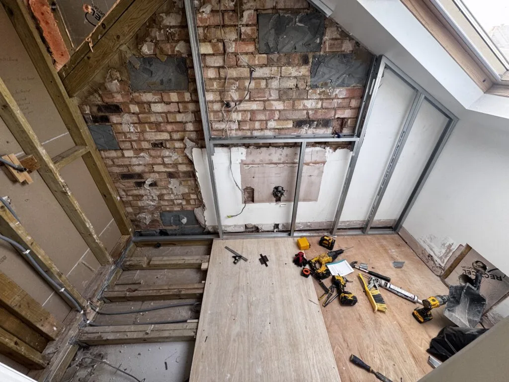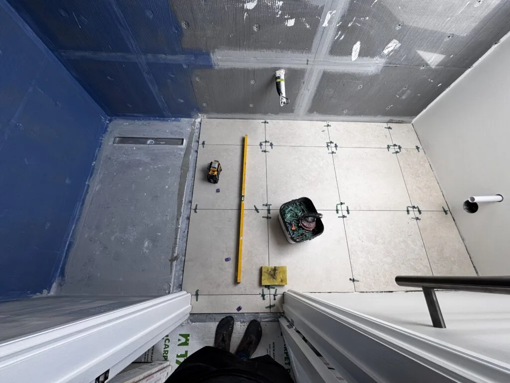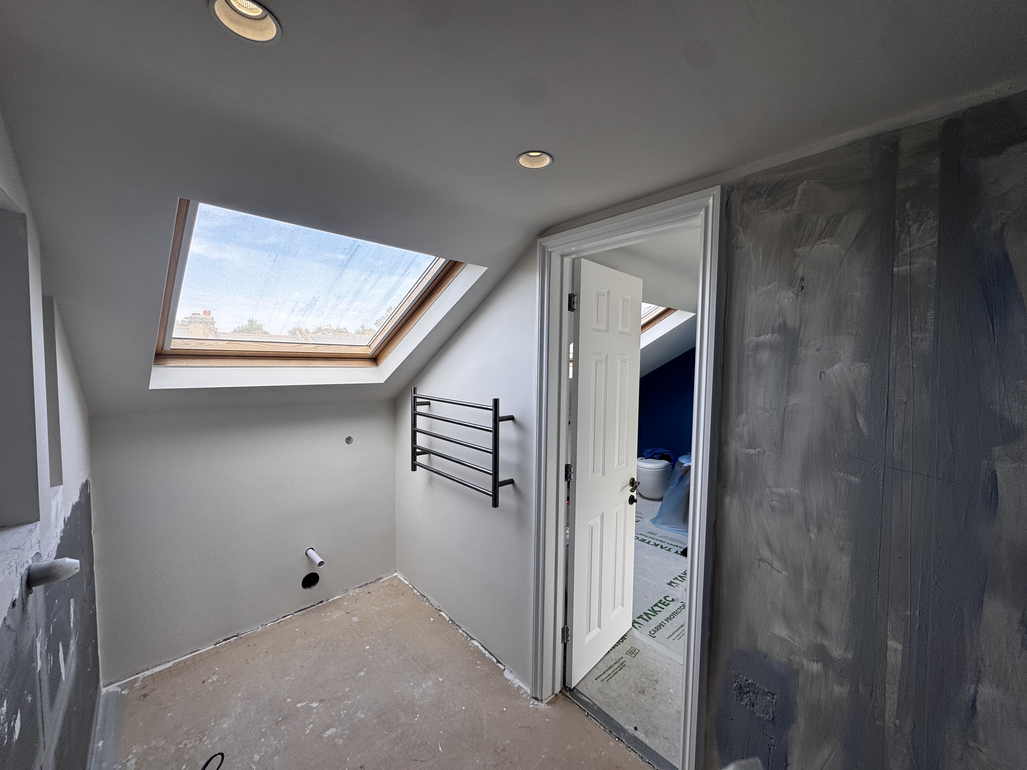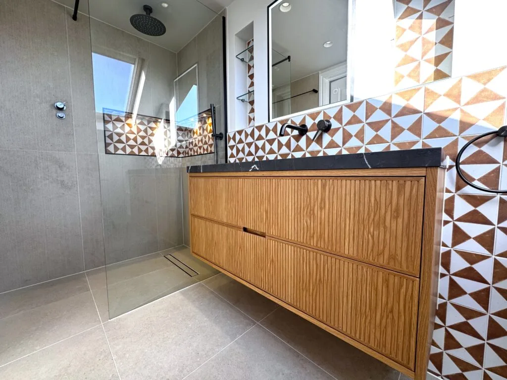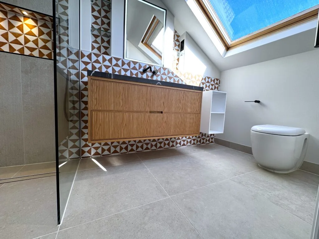 This stunning modern wet room refurbishment showcases the perfect combination of elegance, comfort, and practicality (completed August 2025).The project features a walk-in shower area with a sleek glass screen, a contemporary wall-mounted toilet, and a stylish vanity unit with storages— all designed to maximise space and create a seamless, modern look.