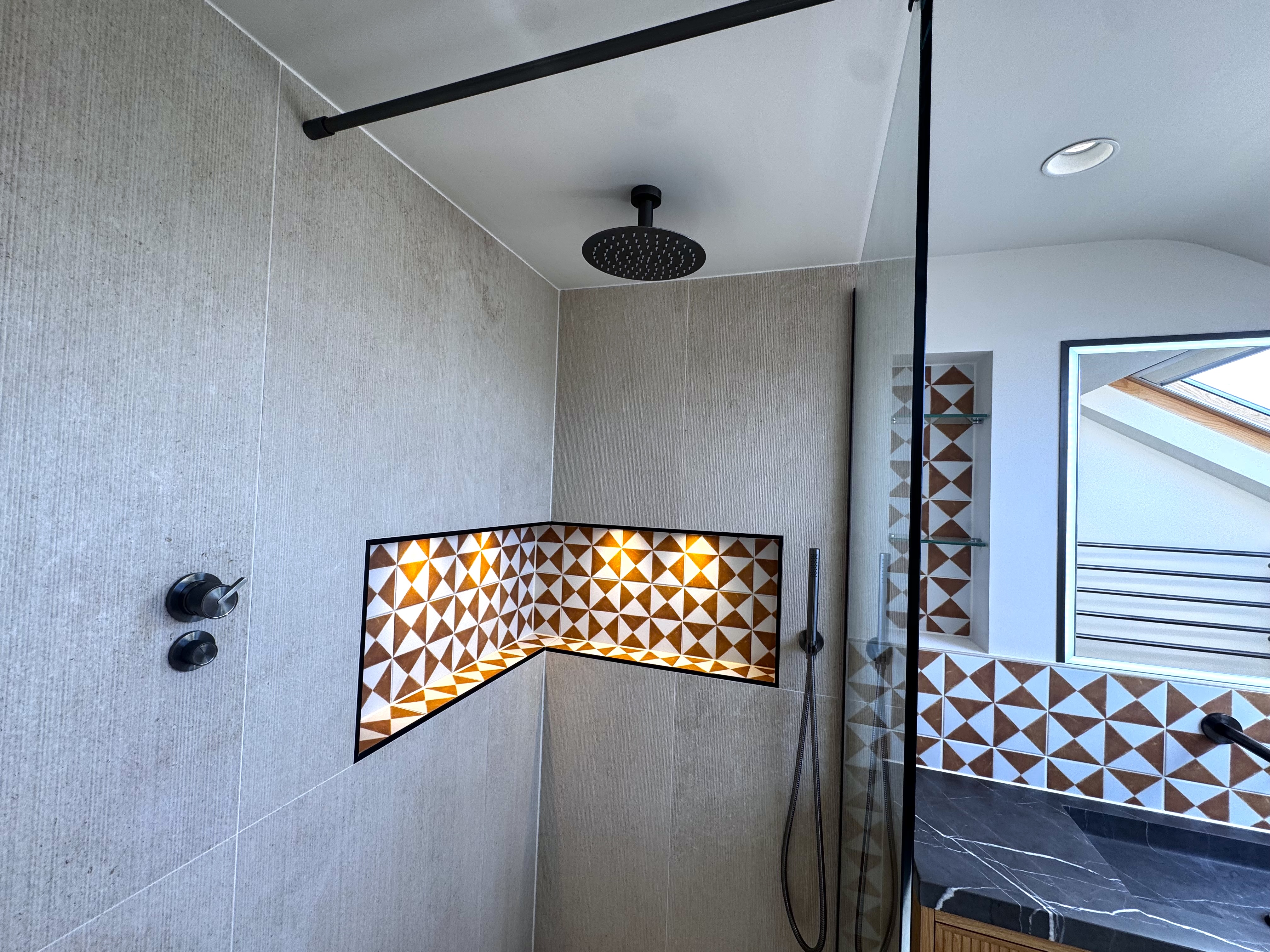 ⚡️Bespoke recessed niches and glass shelving for clean, clutter-free storage.